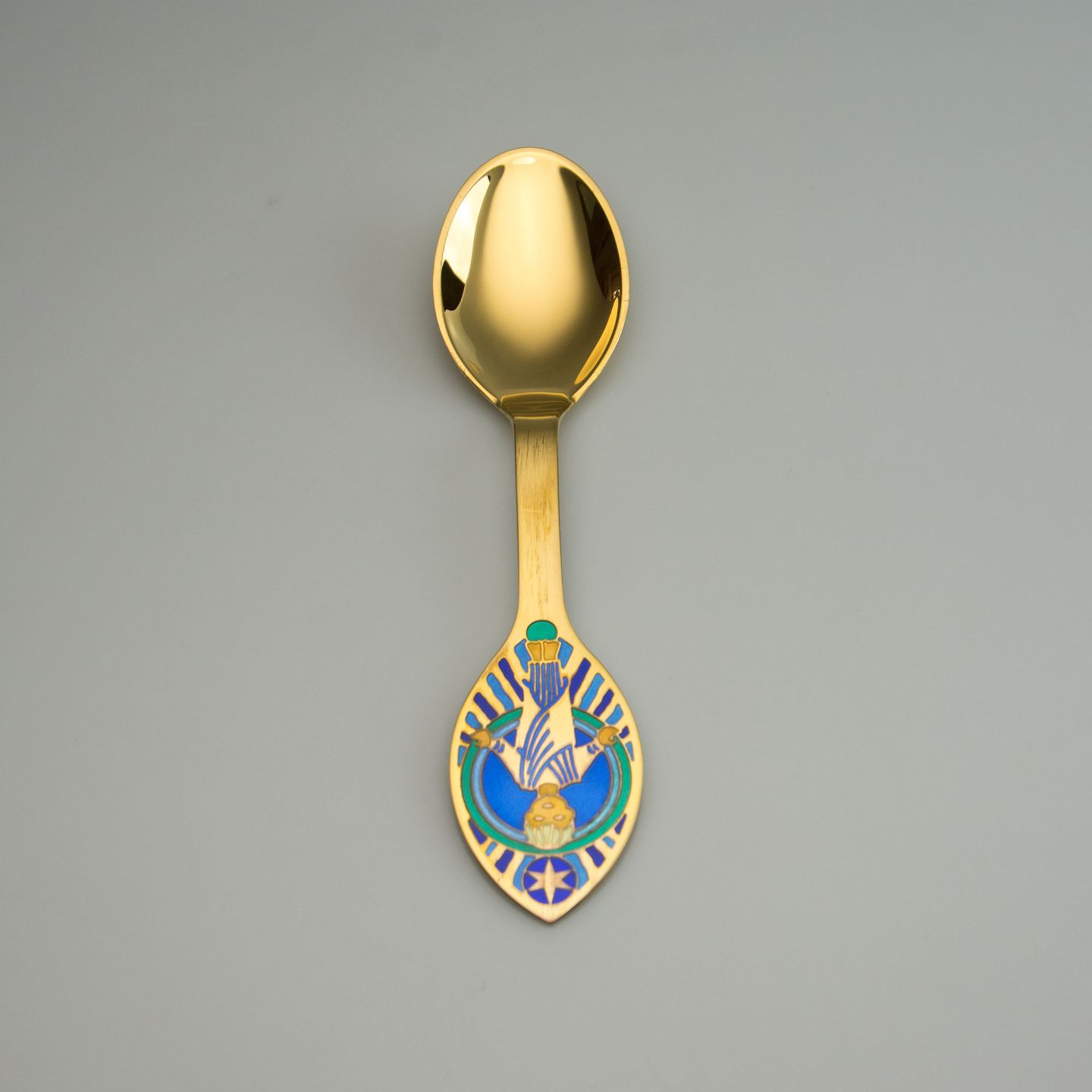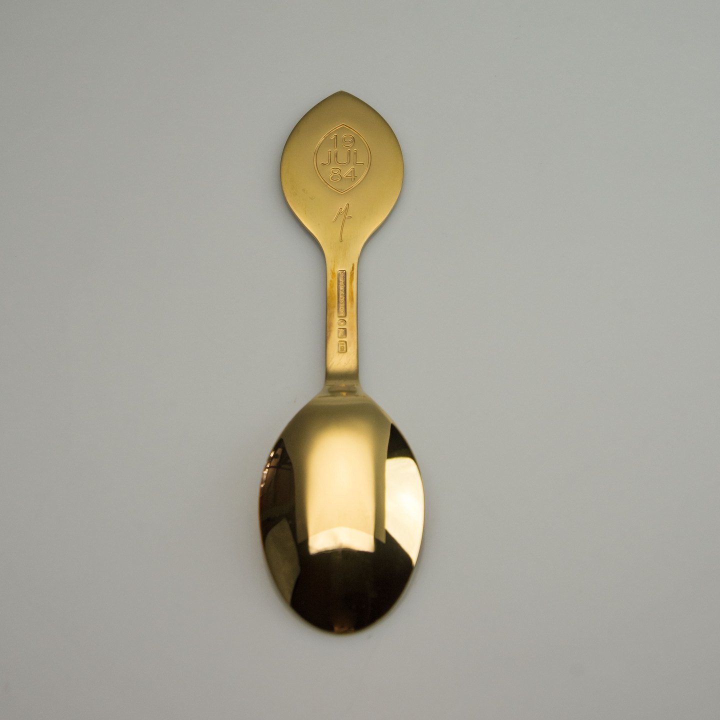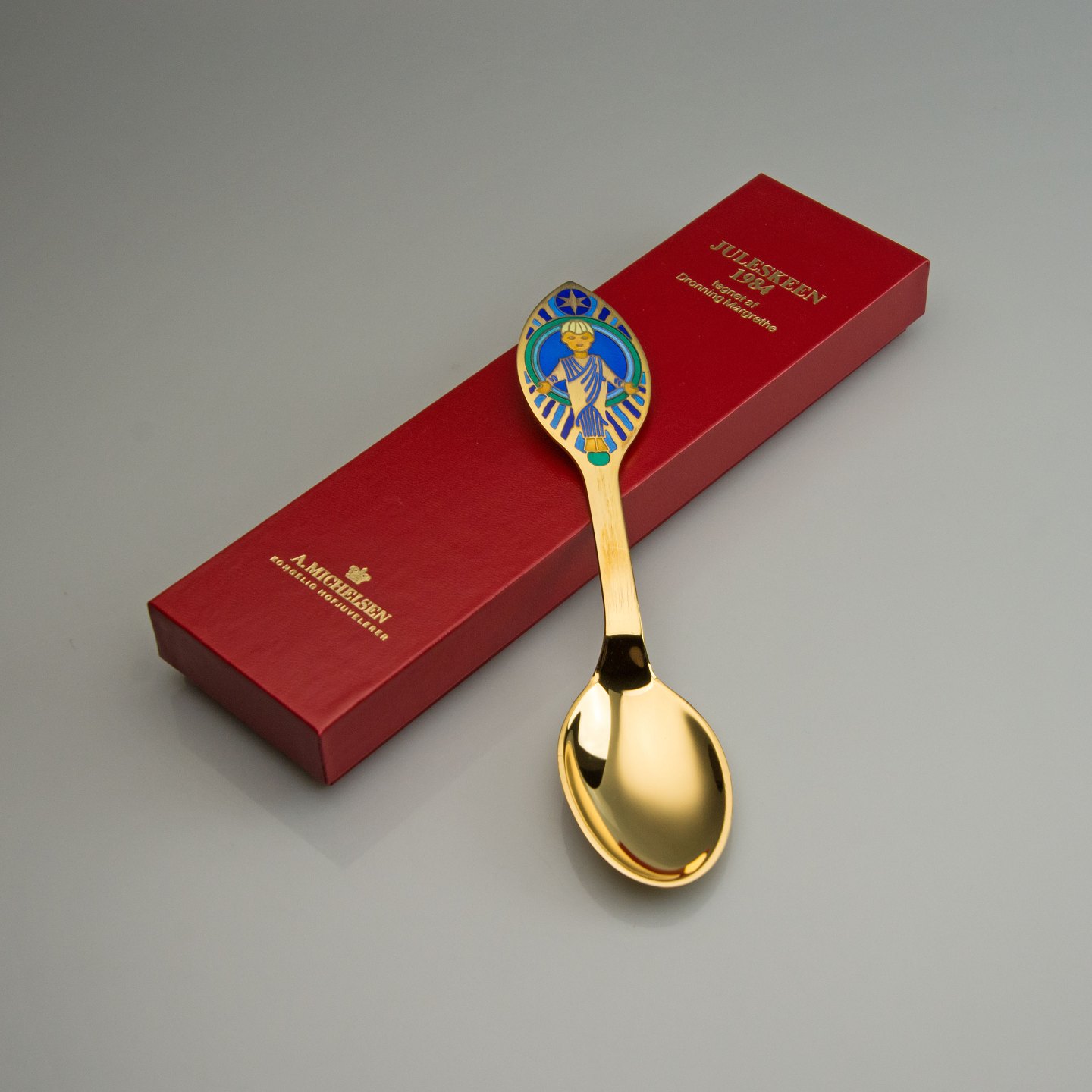 Juleske fra år 1984 med motiv af Jesusbarnet i forgyldt sølv