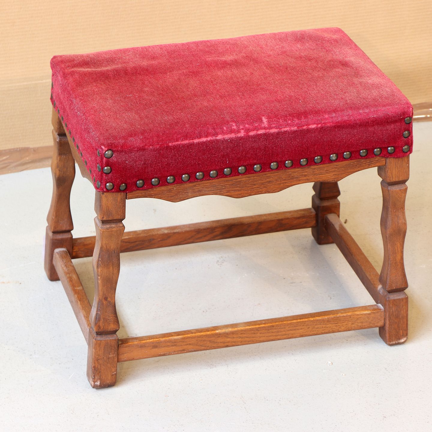 Fodskammel i bejdset egetræ m. slidt velourbetræk,
