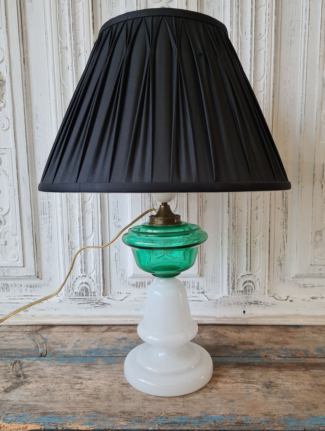 Smuk opaline olielampe med oliebehoder i smaragdgrønt glas, omlavet til el.