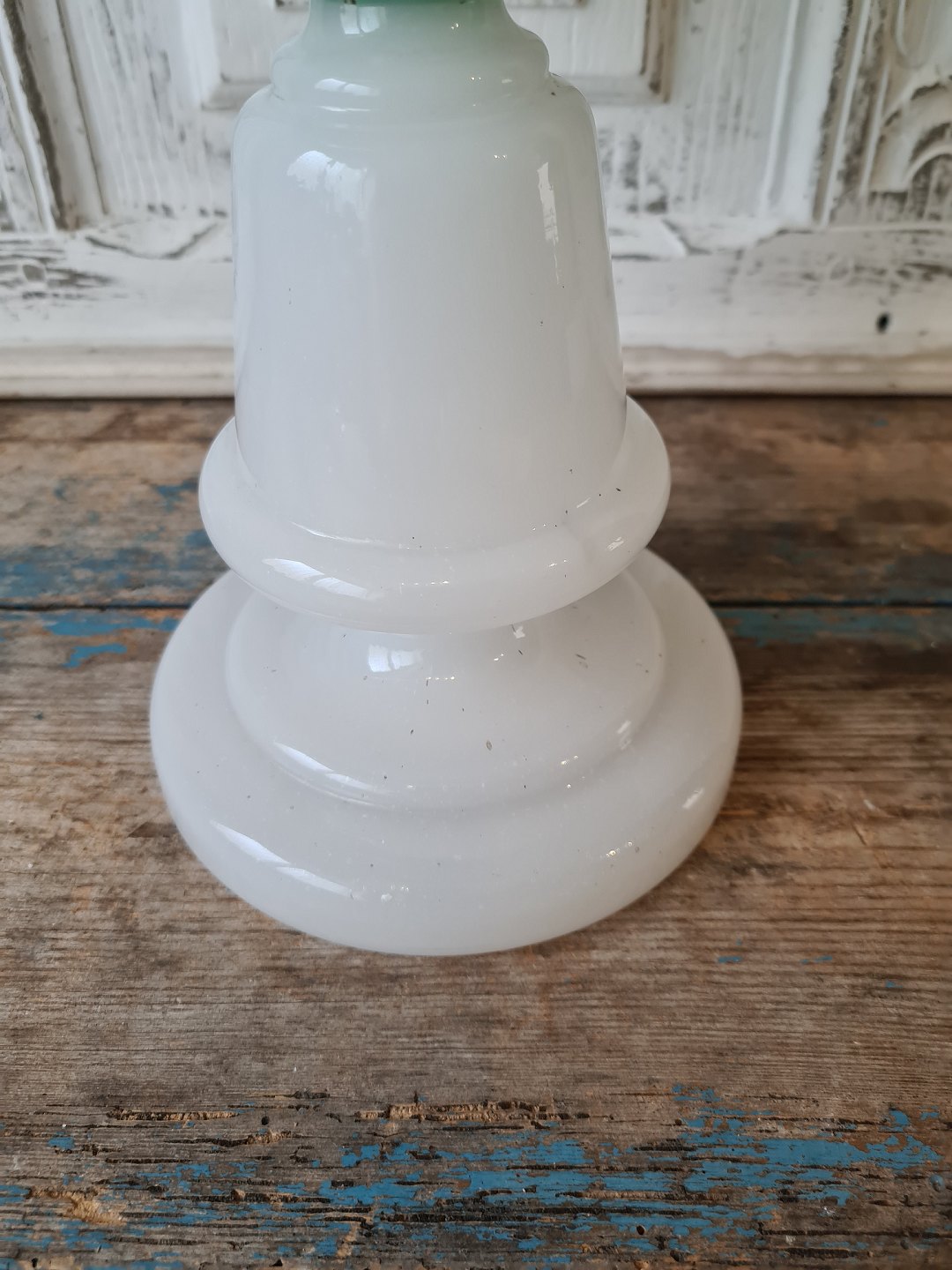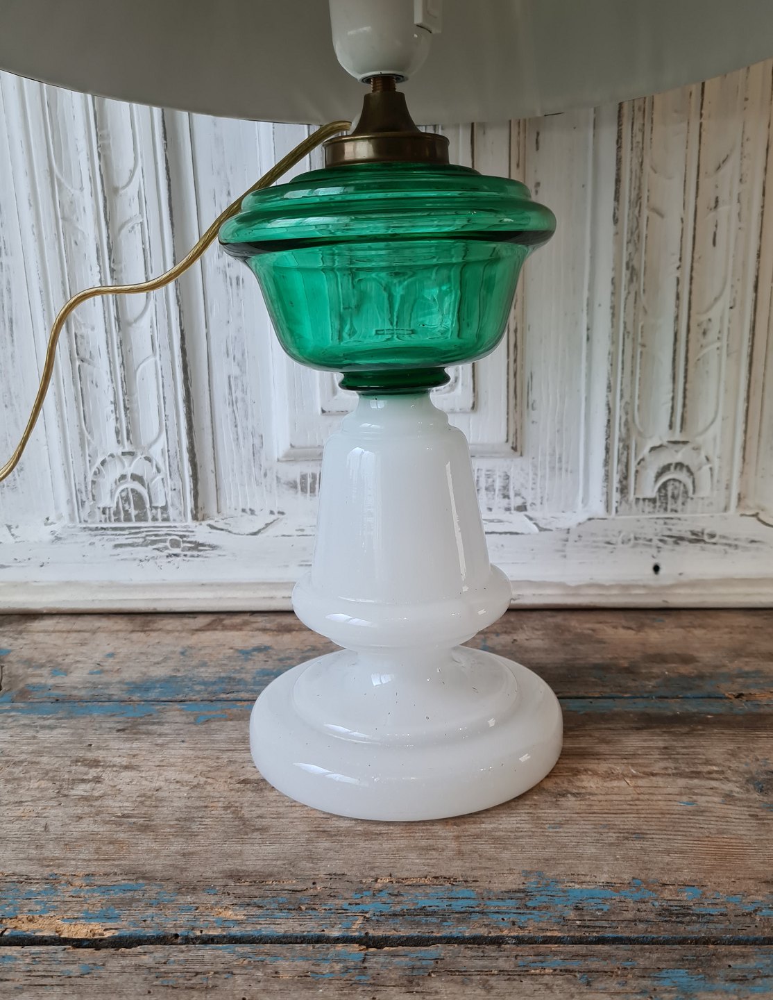 1800tals opaline lampe med oliebeholder i smaragdgrønt glas