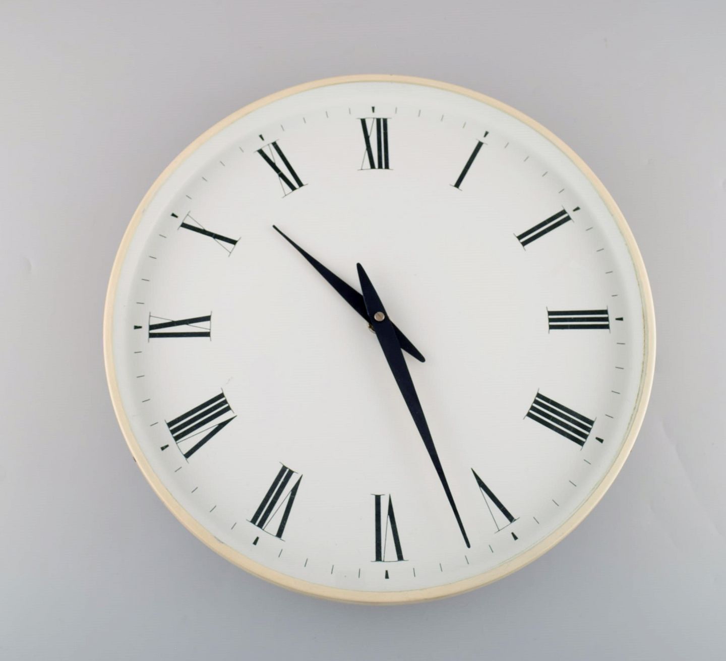 Henning Koppel for Georg Jensen . Vægur af hvid plast. Urskive med romertal samt visere. Urværk quartz. 1960/70'erne.