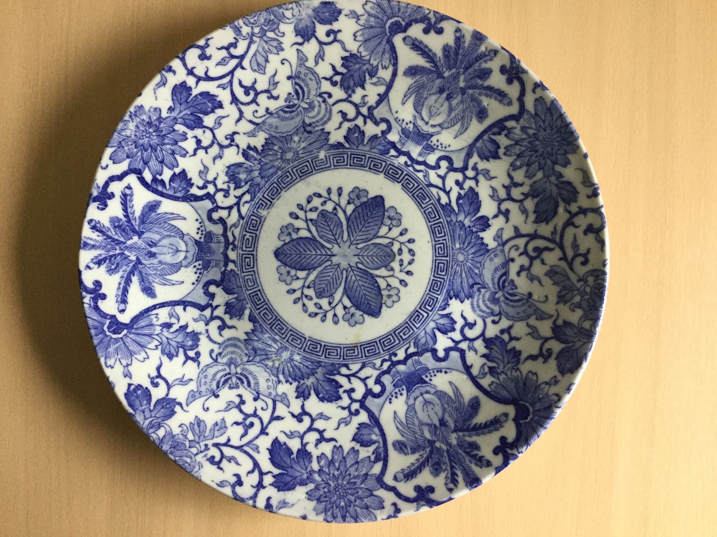 Japansk Imari fad med blå transfer dekoration.