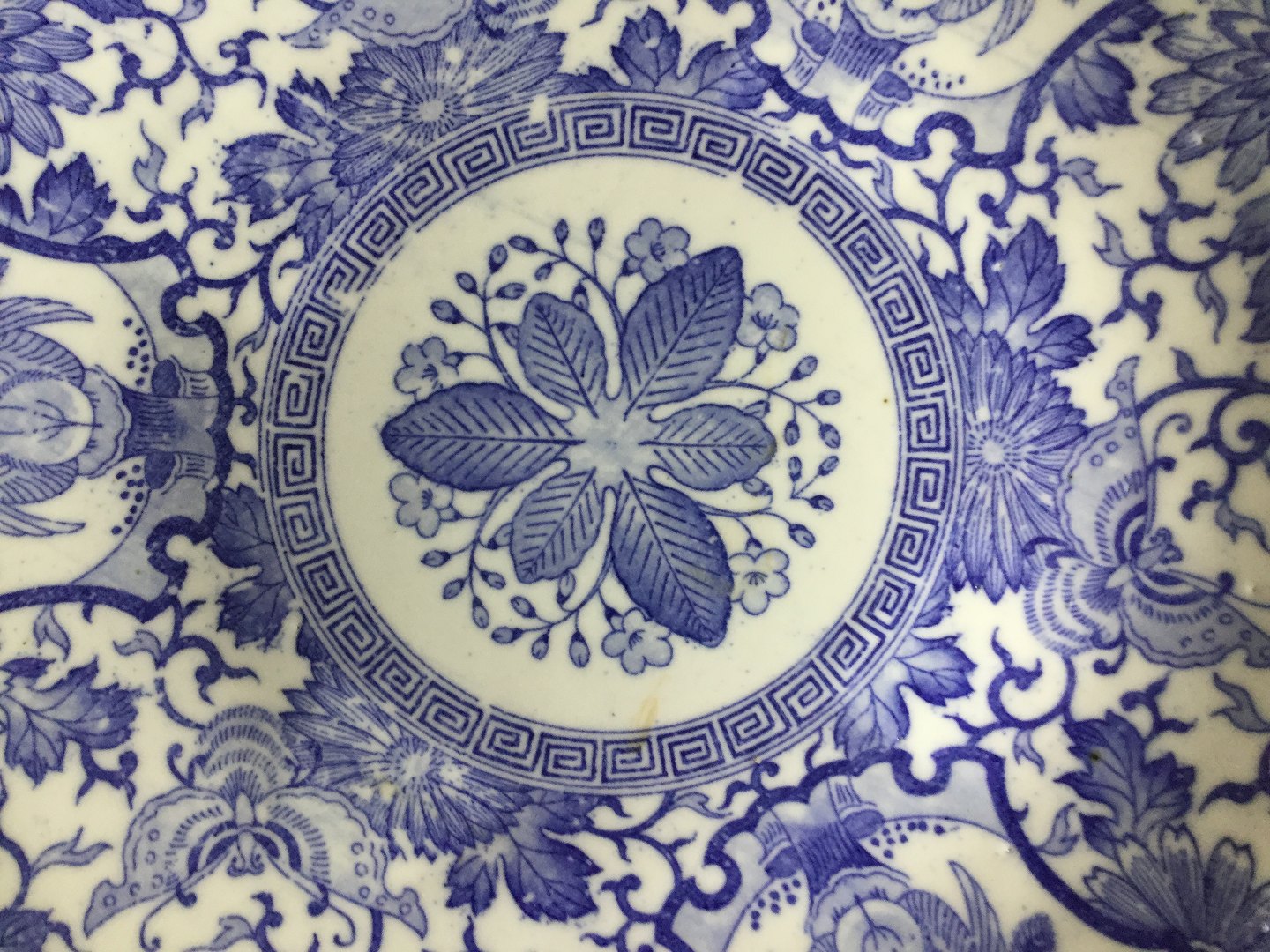 Porcelæn dekoreret med blå transferdekoration i form af blomster, blade, sommerfugl og a la greque bort.