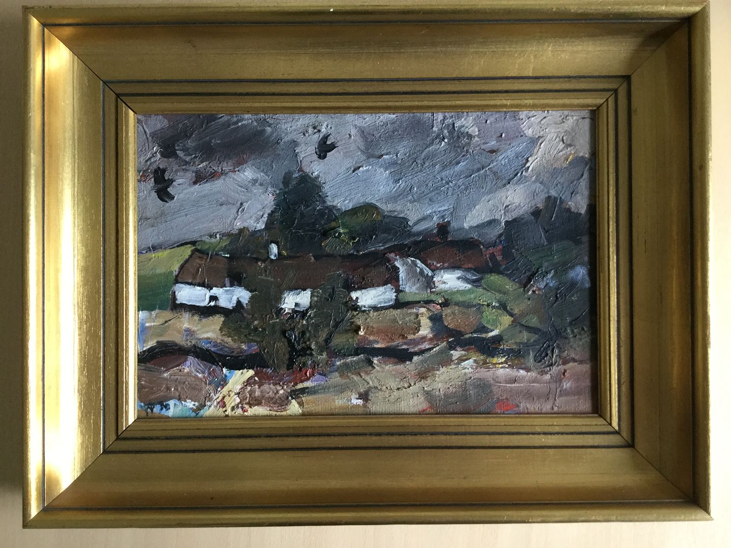 Maleri af William Hansen - Landskab med gårde og fugle 1974
