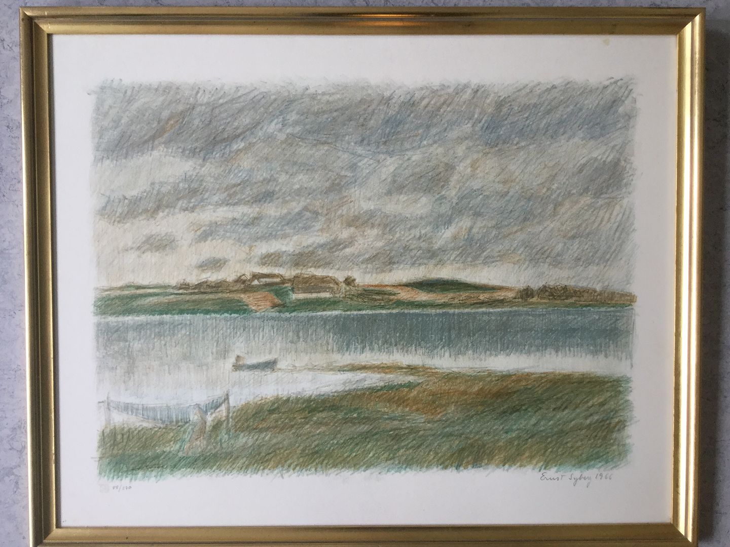 Farvelitografi af Ernst Syberg 1966 - Landskab med å løb og båd.