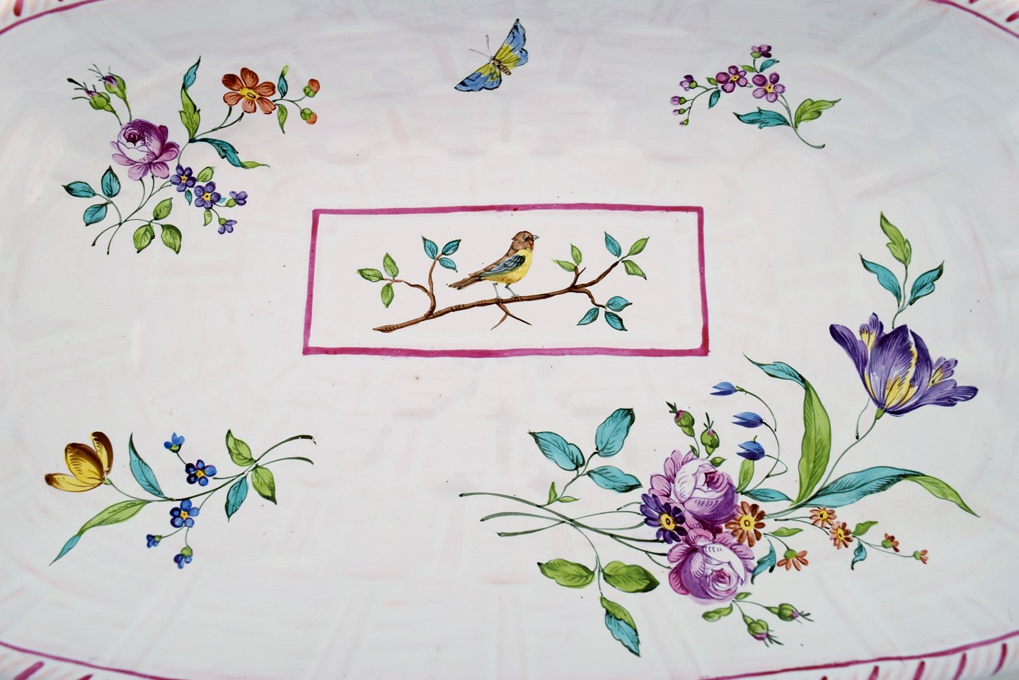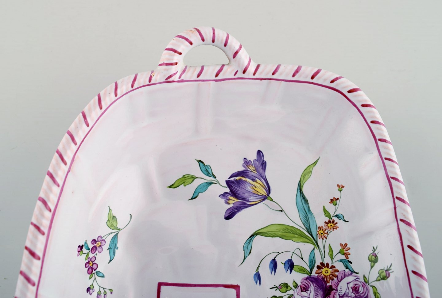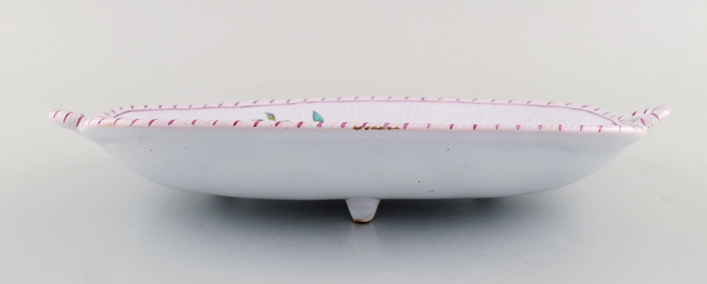 Emile Gallé for St. Clement, Nancy. Fad på fire fødder i håndmalet fajance. Dekoreret med blomster og fugle. 1870'erne.