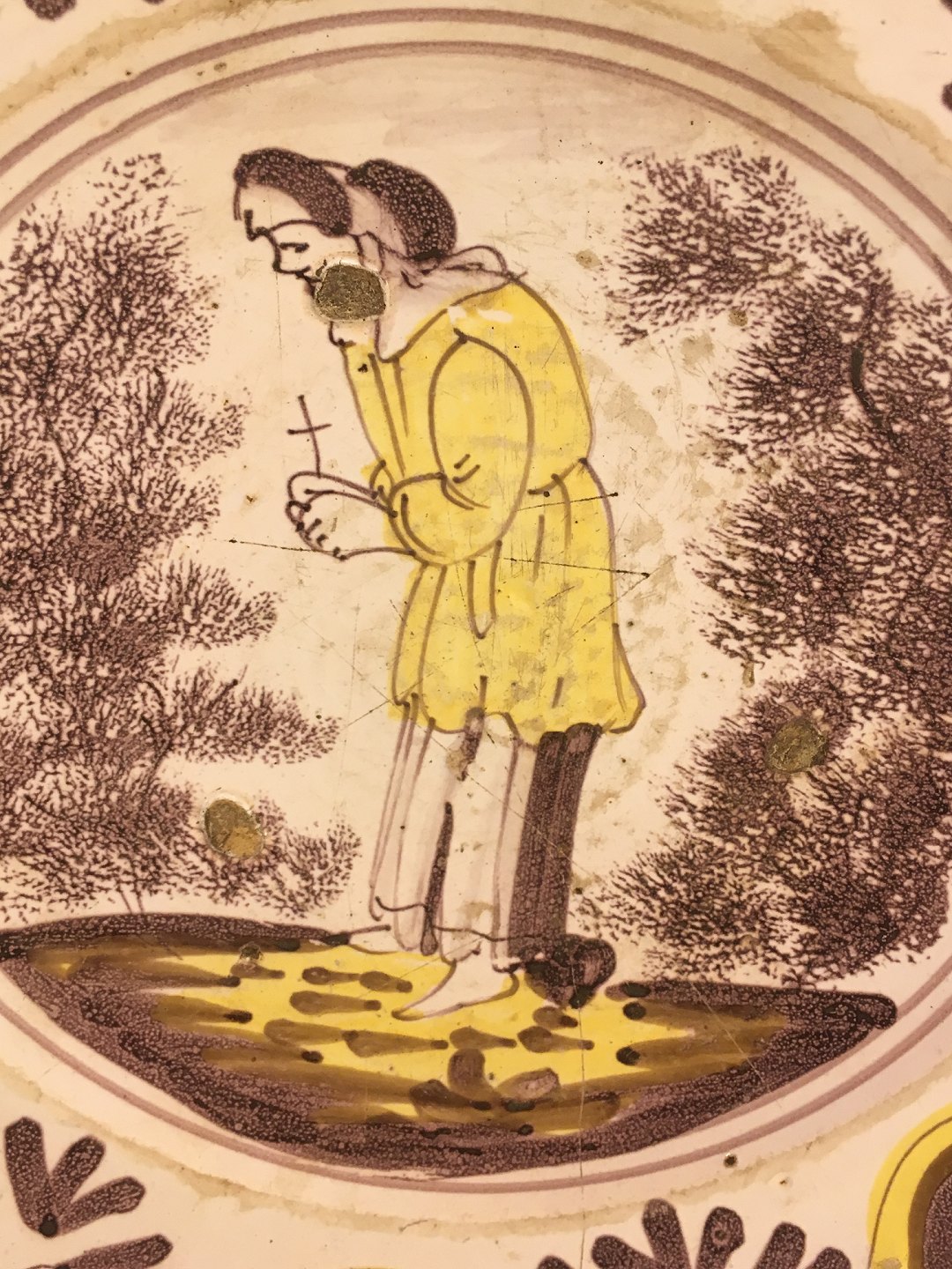 Ca. 1730. Udført i Holland i Makkum, på værkstedet Tichlaar, der blev etableret i 1669.