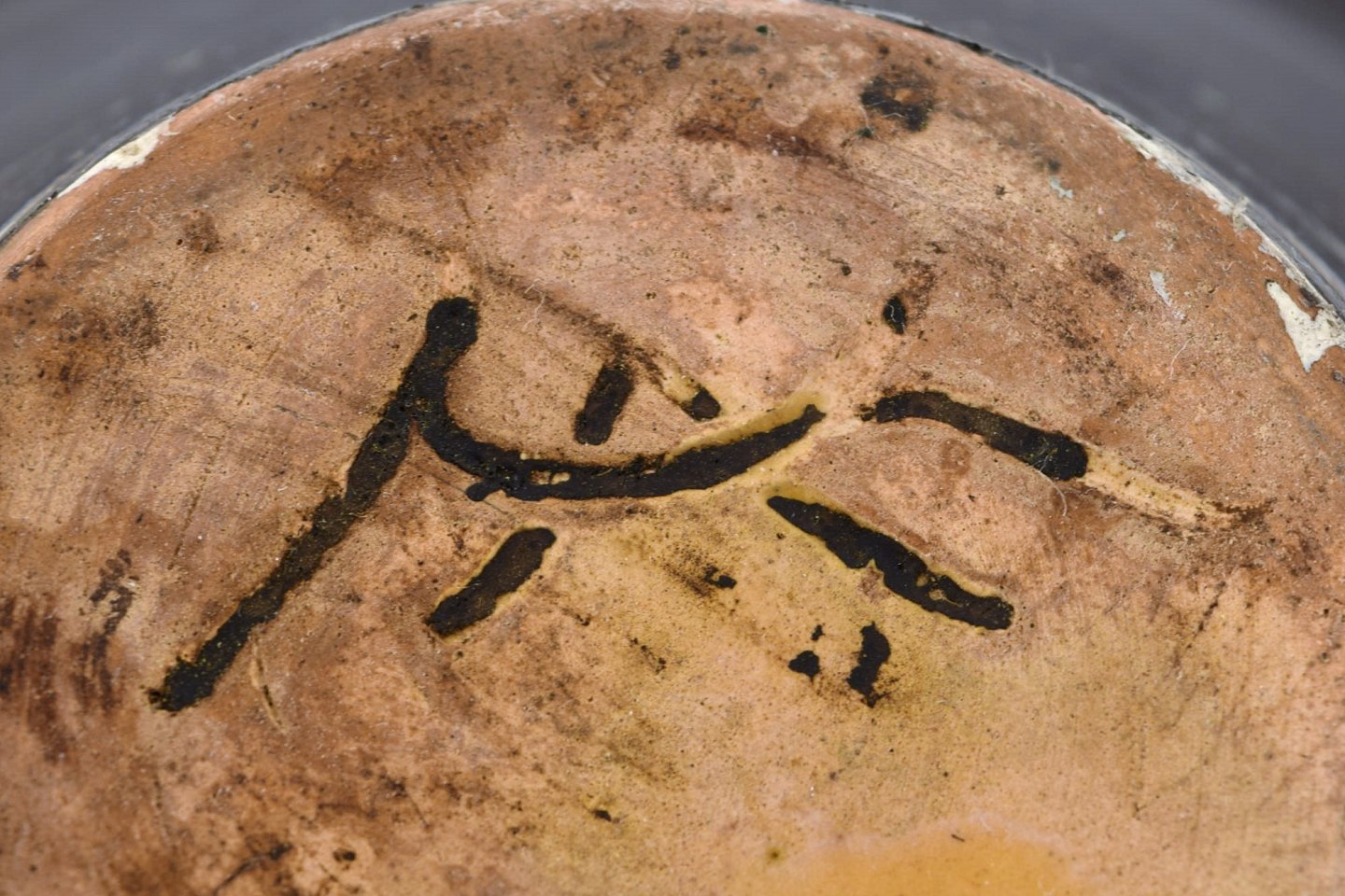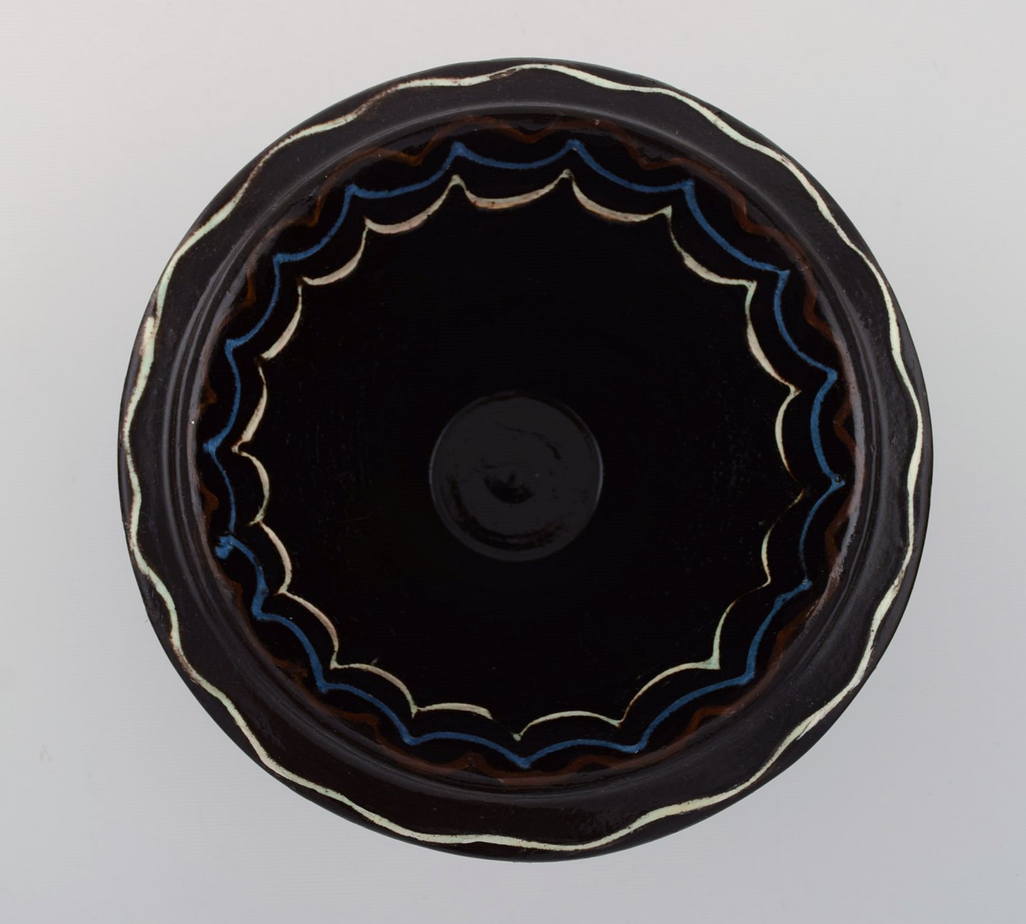 Kähler, HAK. Skål i sortglaseret keramik med blå og hvide bølger langs kanten. 1930/40'erne.
