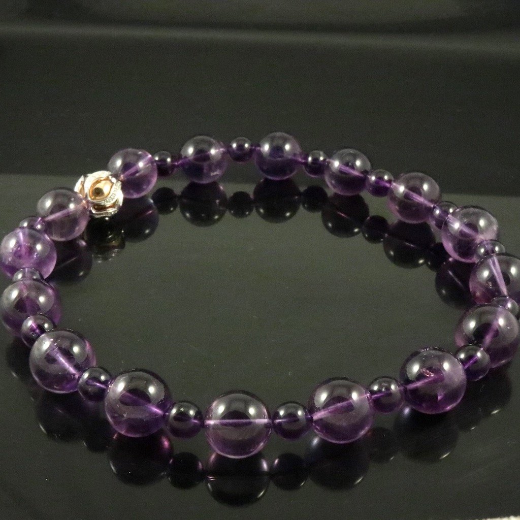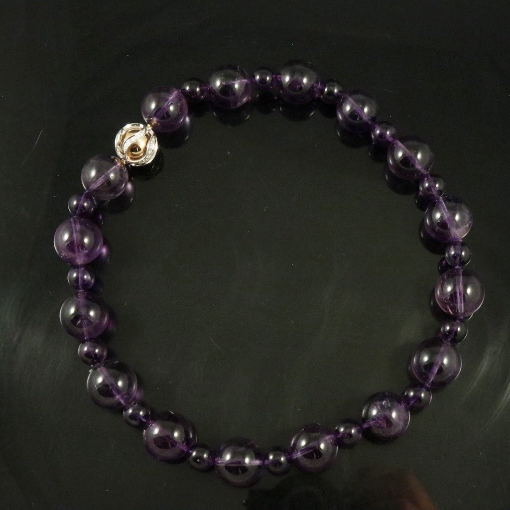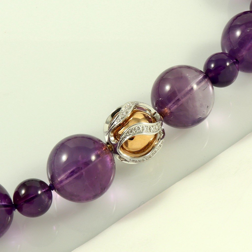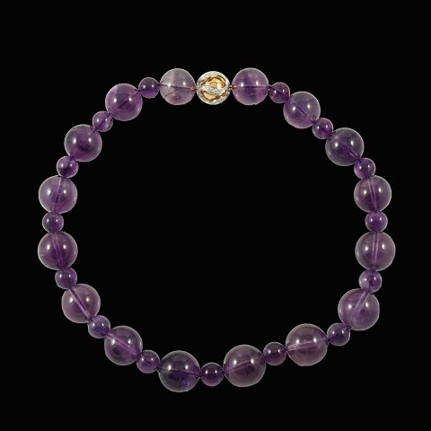 Jörg Heinz. Ametyst halskæde med kuglelås i 18k guld med diamanter 0.5 ct.