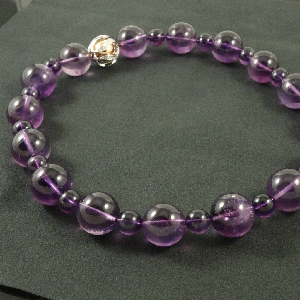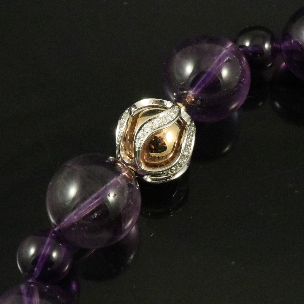Jörg Heinz. Ametyst halskæde med kuglelås i 18k guld og hvidguld med diamanter 0.5 ct.