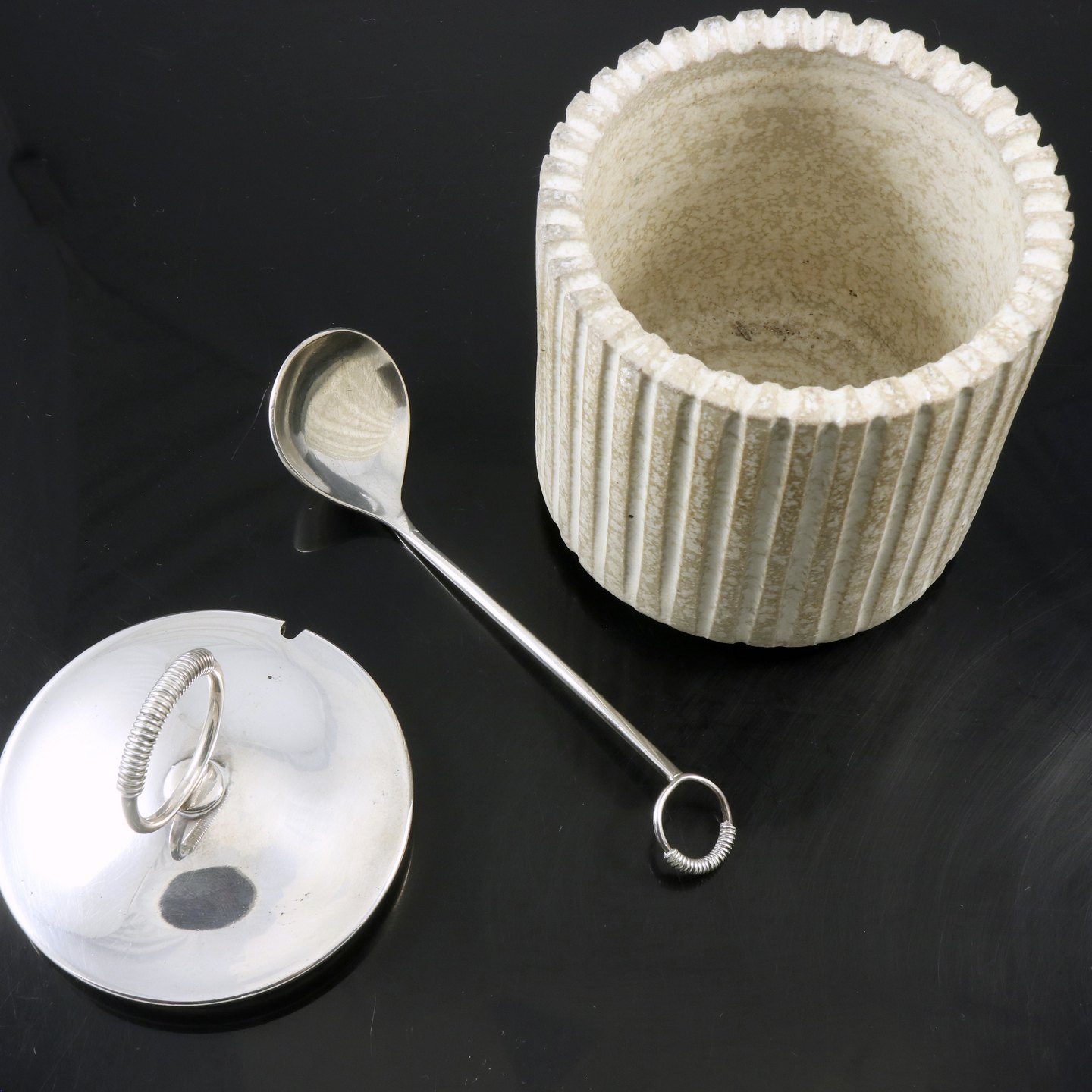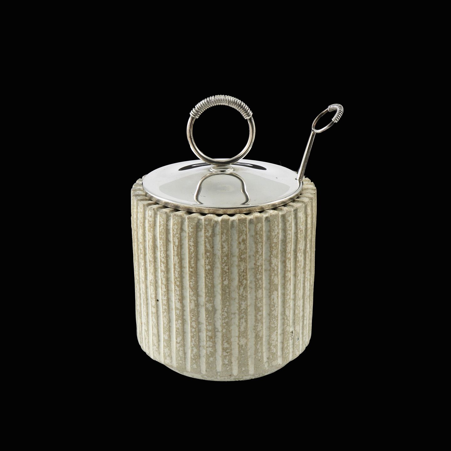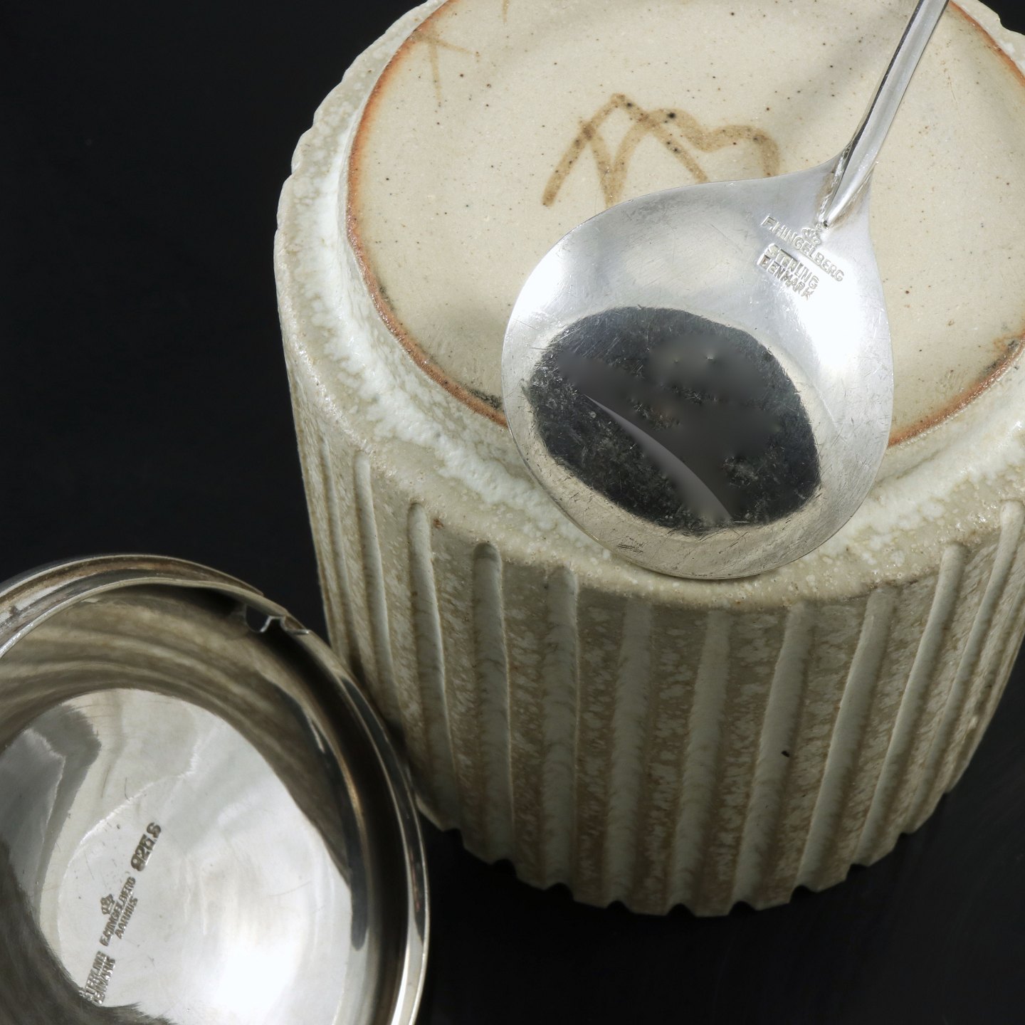 Arne Bang - Hingelberg. Krukke i stentøj med låg samt ske i Sterling Sølv.
