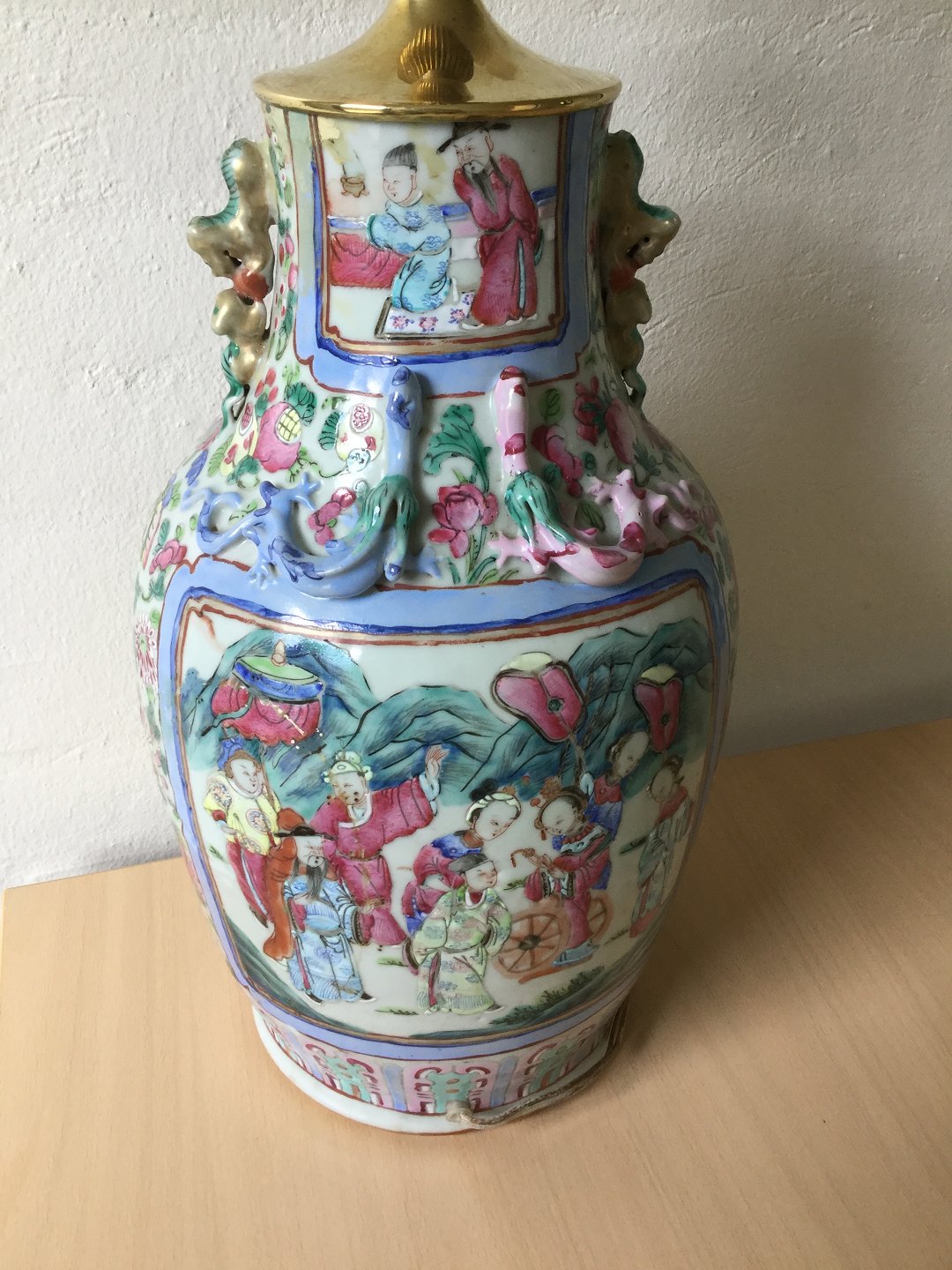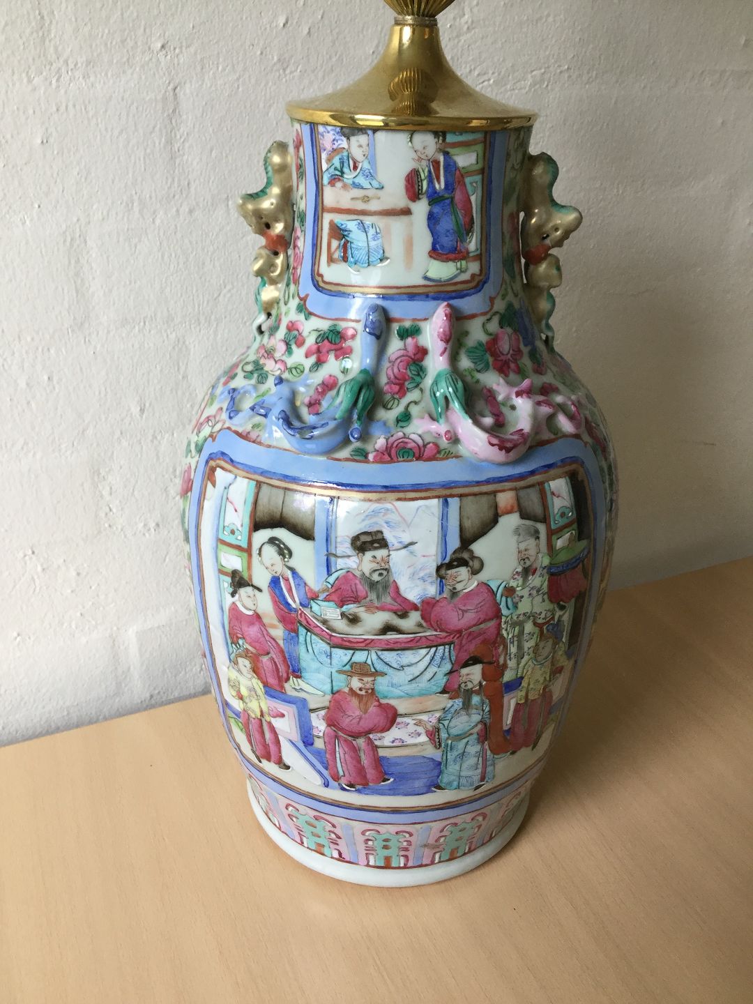 Omlavet til bordlampe med messingmontering. Halsen antagelig slebet ned før montering.