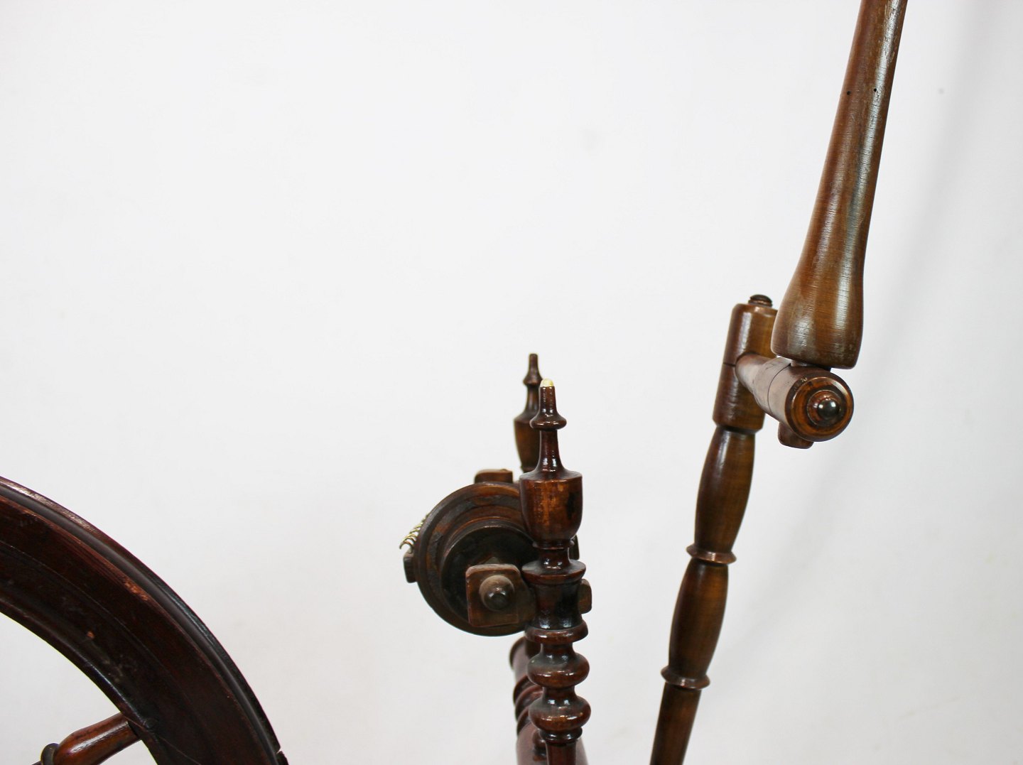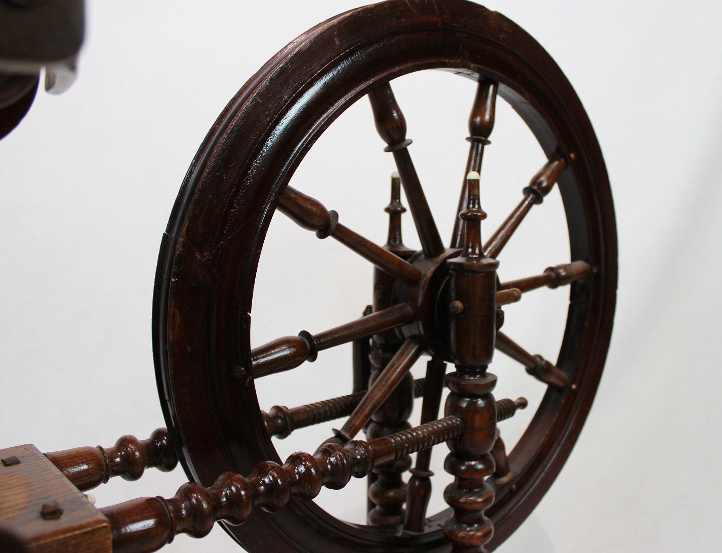Antique spinning wheel of polished wood from around the year 1880.