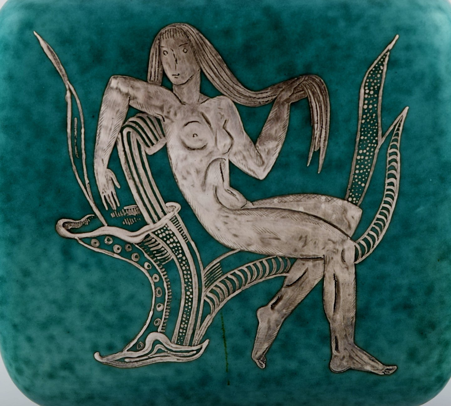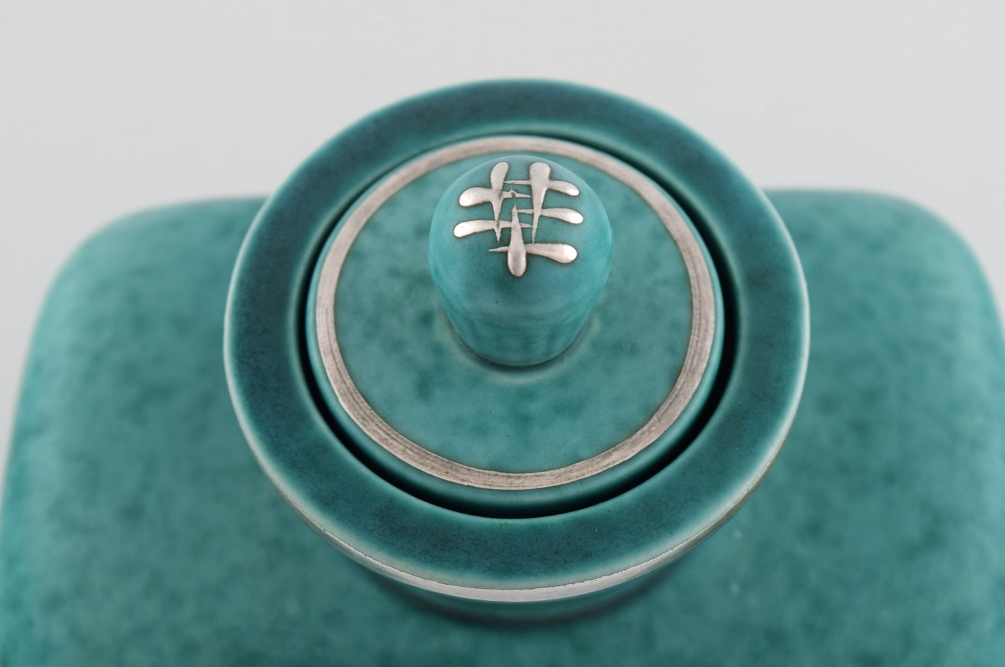 Wilhelm Kåge for Gustavsberg. Argenta art deco lågkrukke i glaseret keramik dekoreret med nøgen kvinde i sølvindlæg.