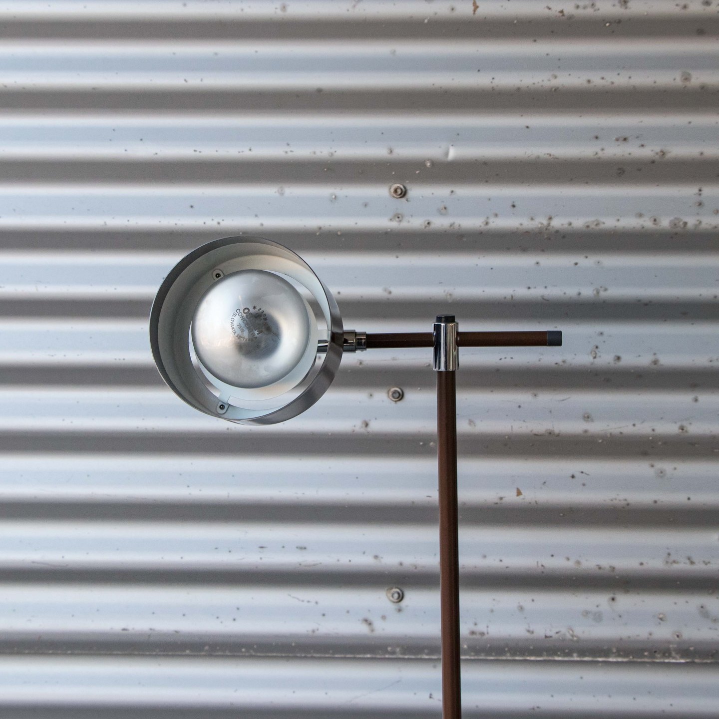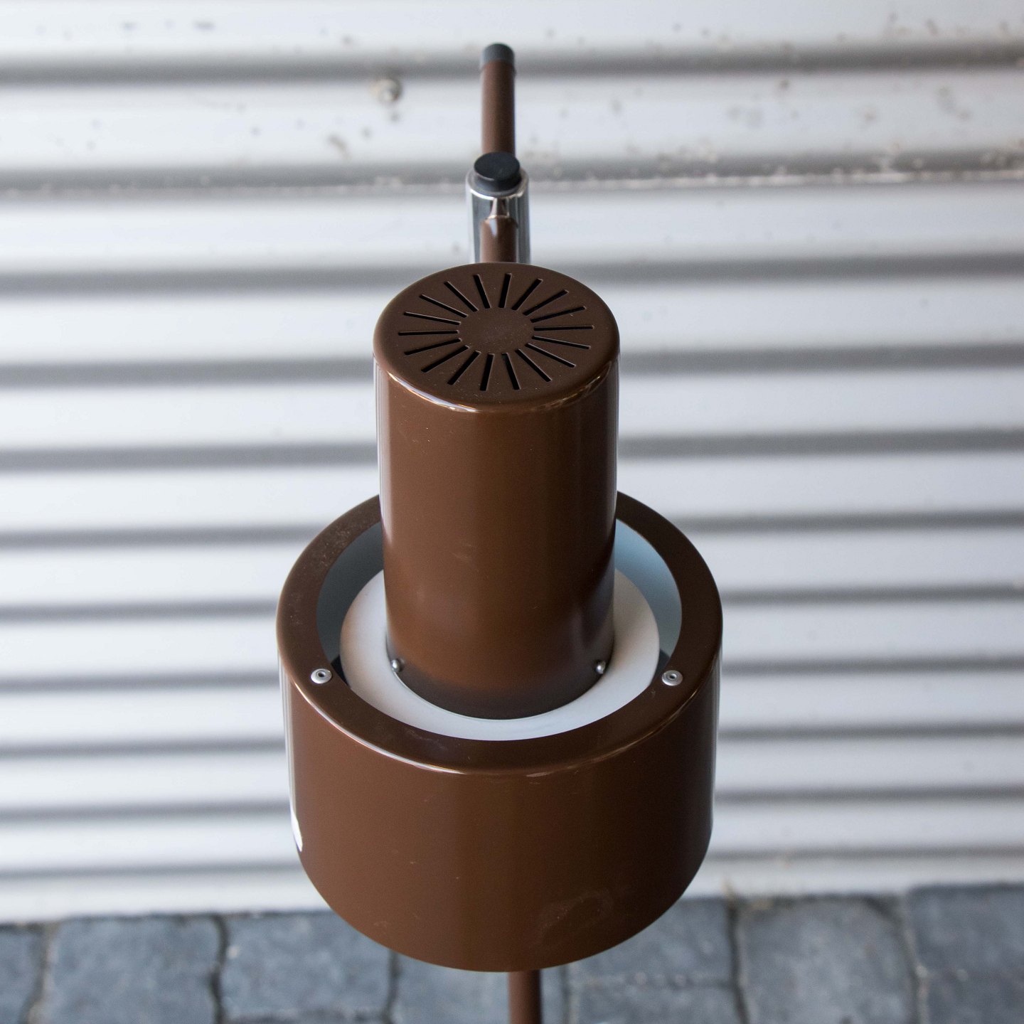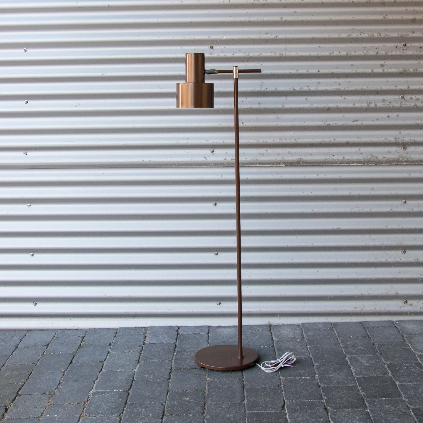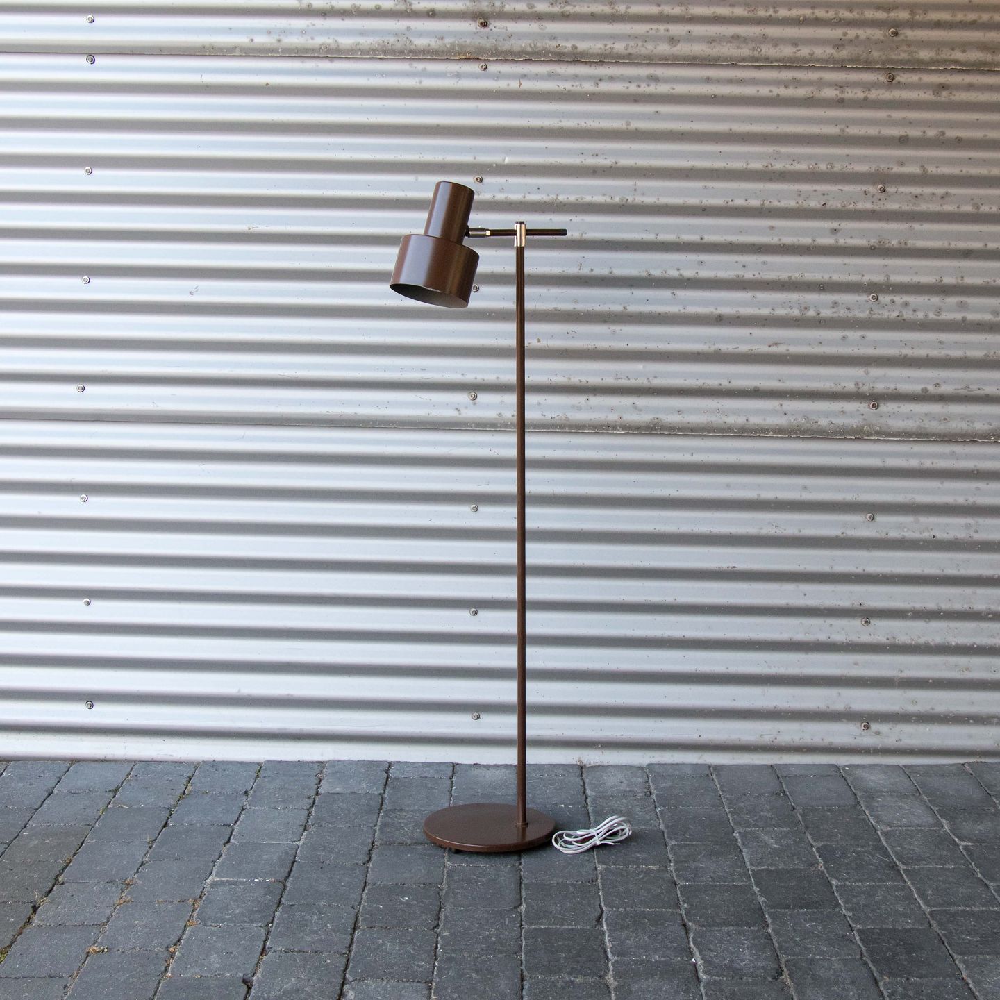 Gulvlampe i brunlakeret metal med skærm af aluminium