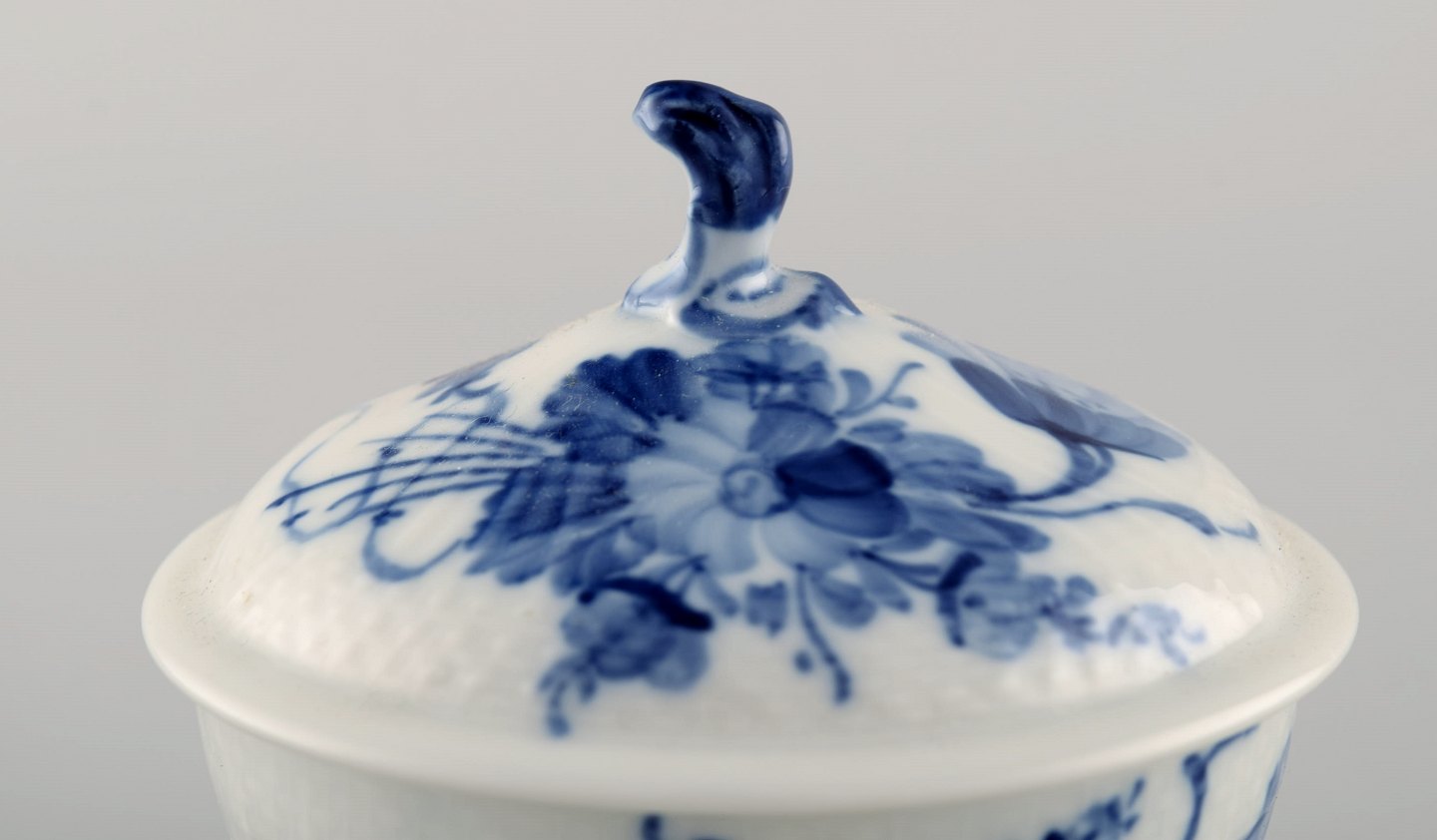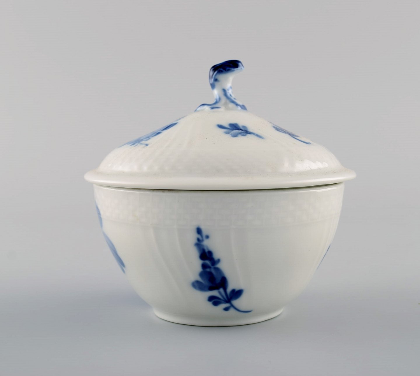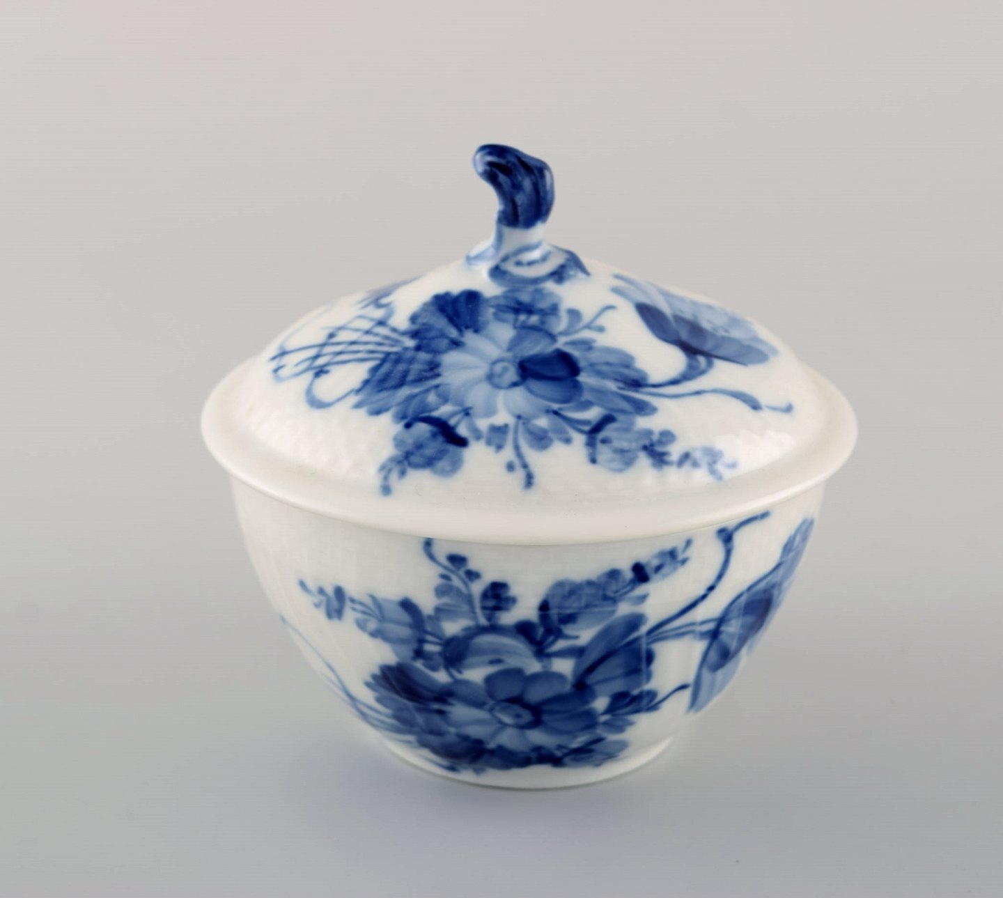 Blå blomst svejfet sukkerskål med låg fra Royal Copenhagen.