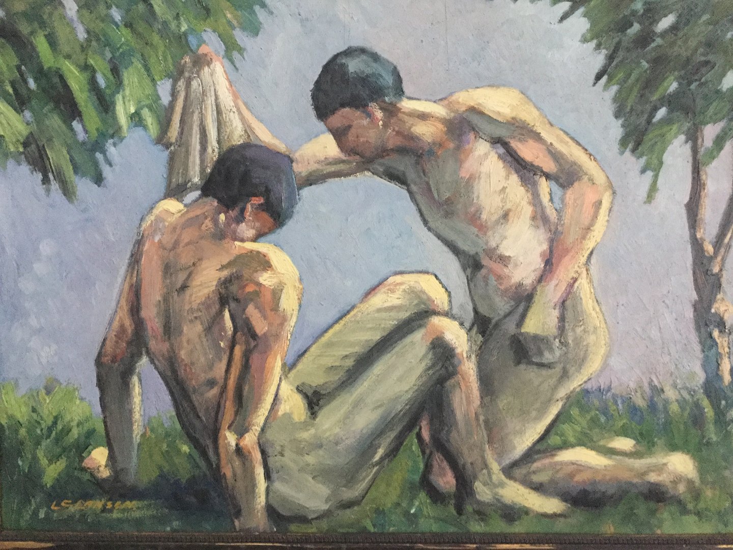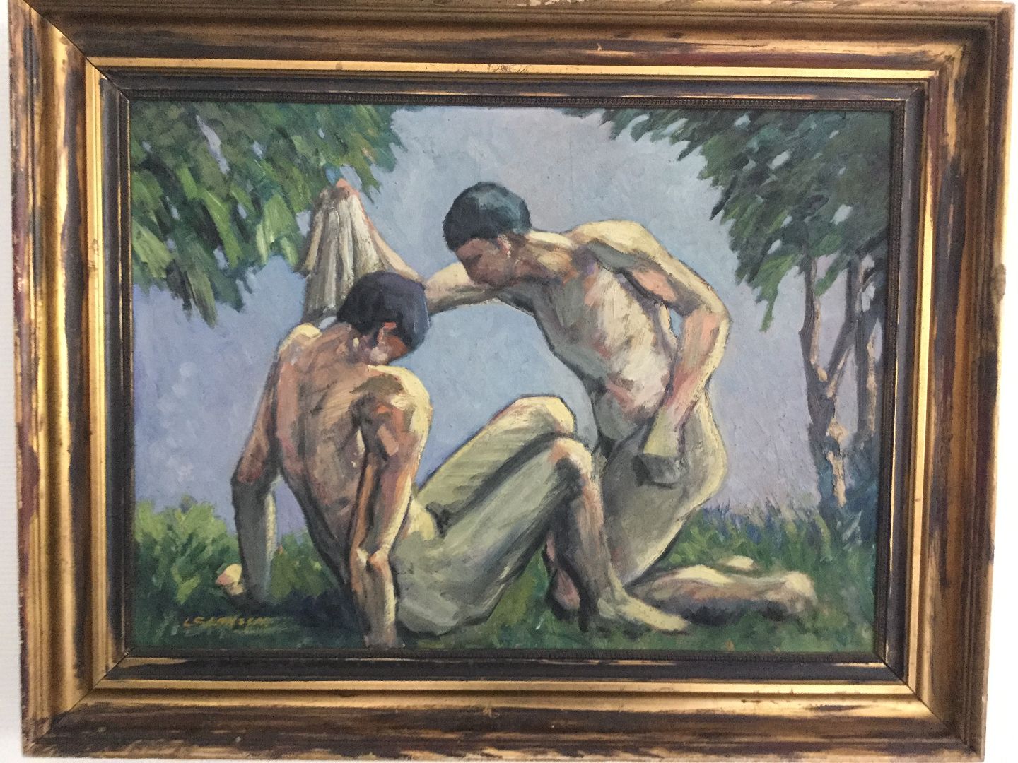Bagpå - Olieskitse til Den Barmhjærtige Samaritan - L.C. Larsen samt udstillingsmærkat fra KE.