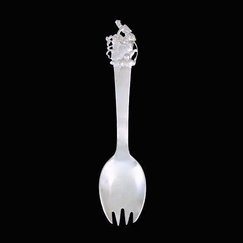 H.C. Andersen Eventyrbestik. 'Fyrtøjet'. Skegaffel i sølv med motiv fra H.C. Andersens eventyr. L. 14,2 cm.