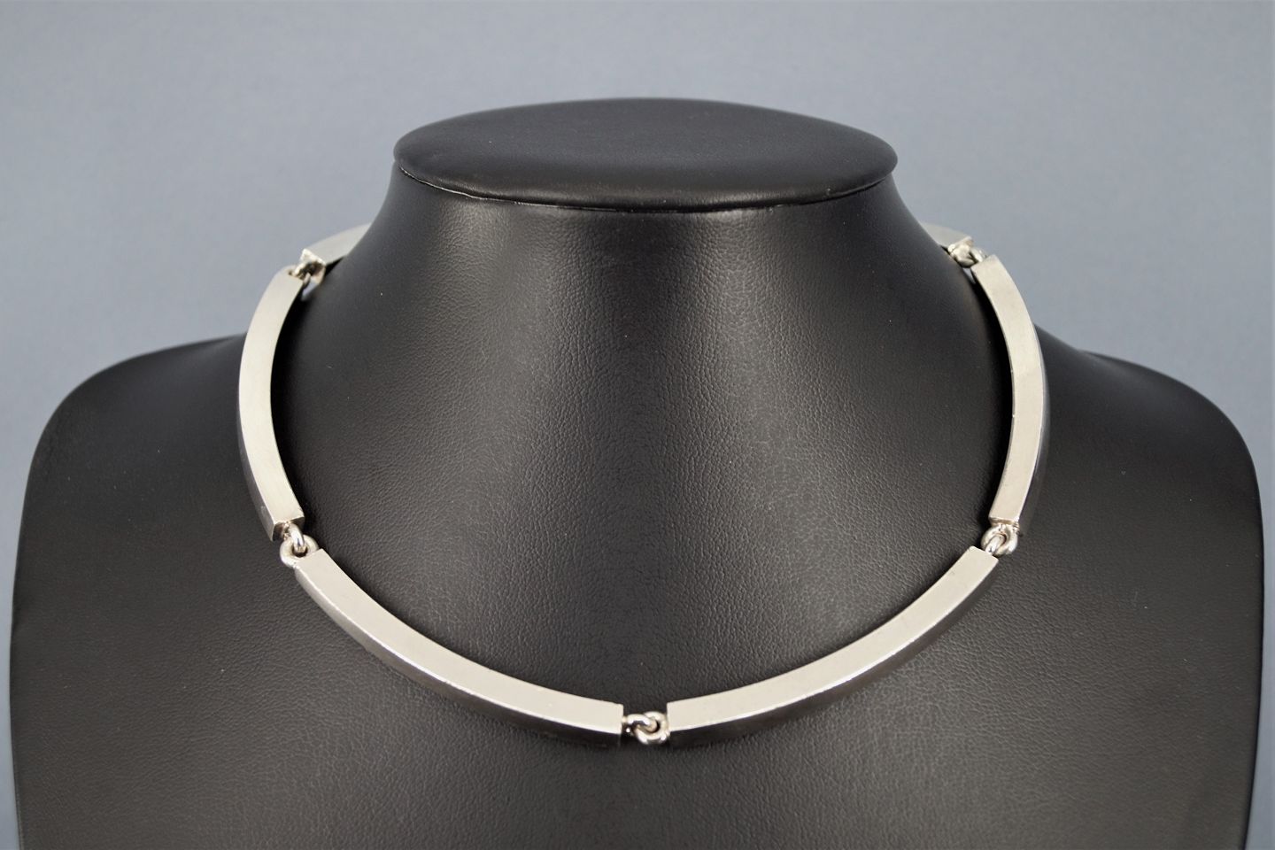 Hans Hansen; Leddelt halsring af sterling sølv. Seks aflange led i alt. L. 39 cm. B. 0,5 cm. Stemplet