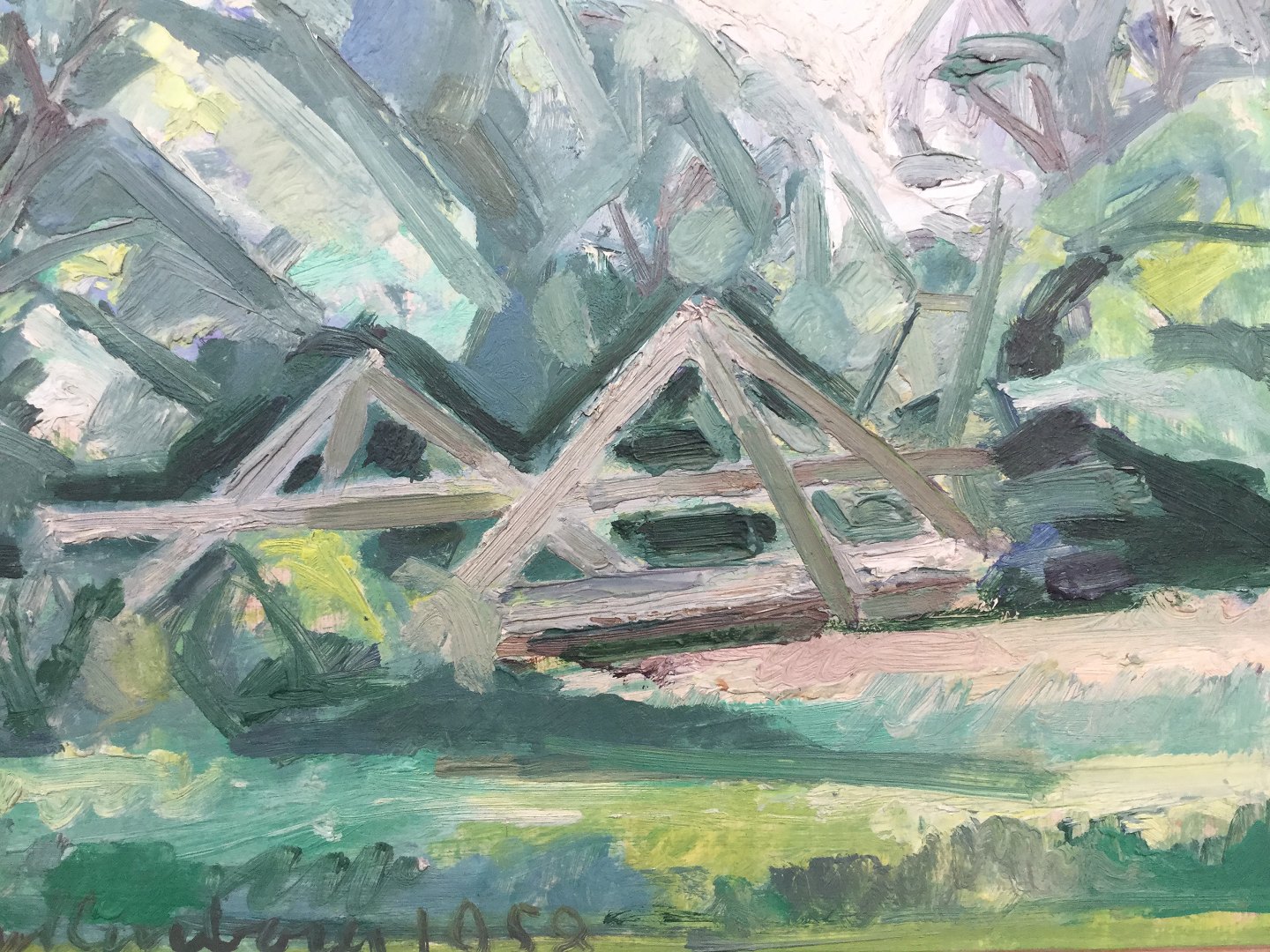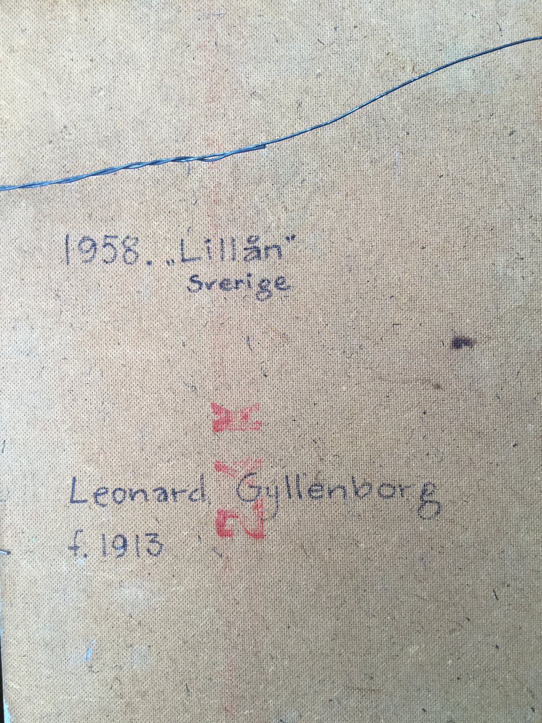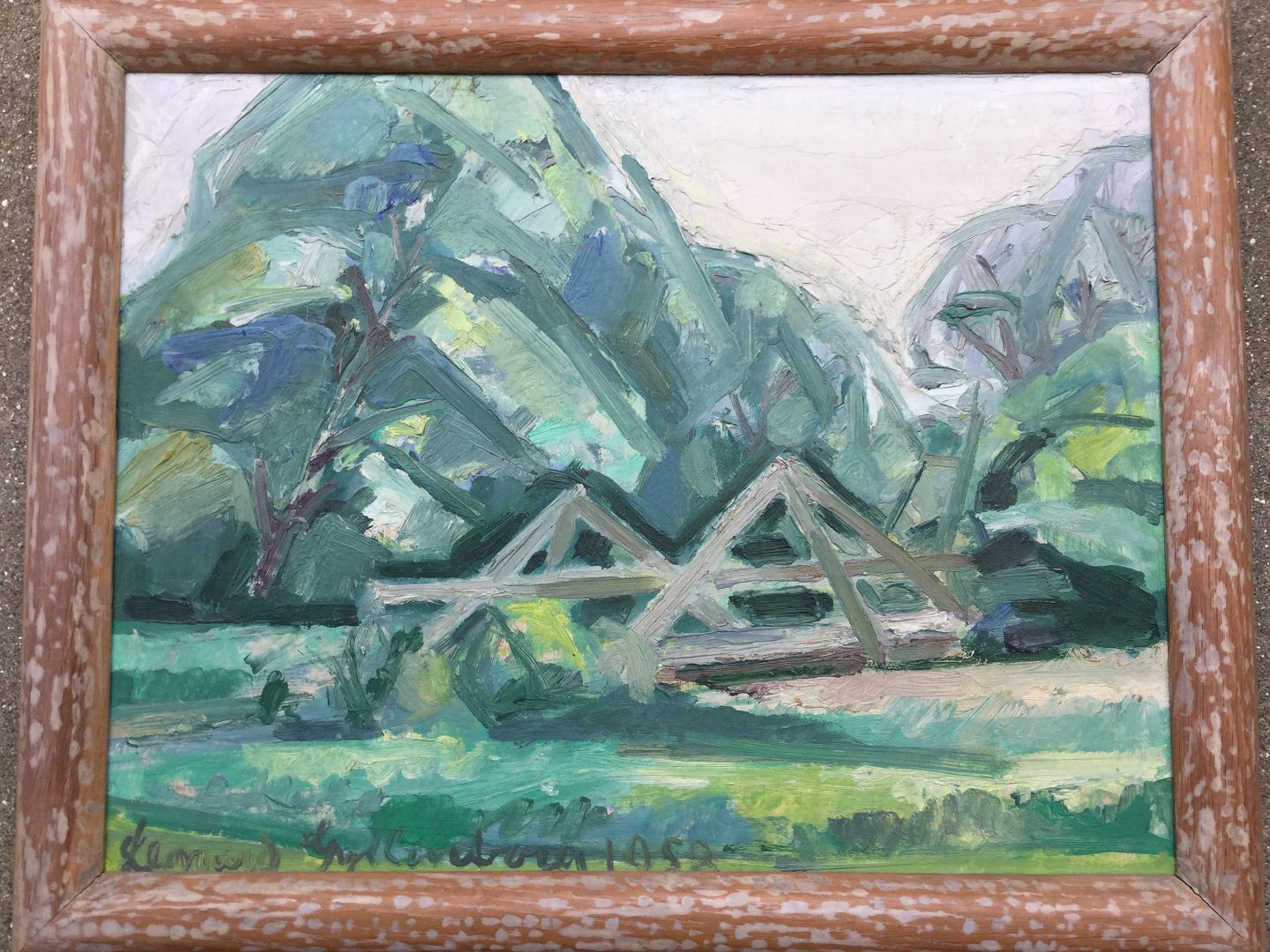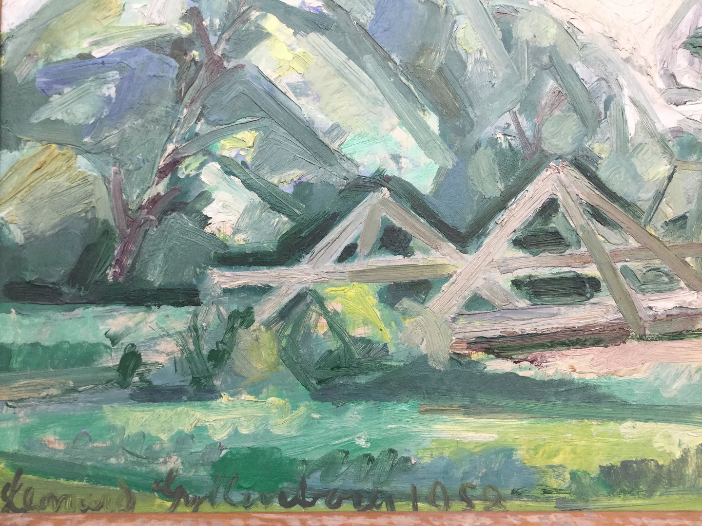 Maleri af Leonard Gyllenborg 1958 - Parti med bro fra Lillån, Örebro, Sverige.