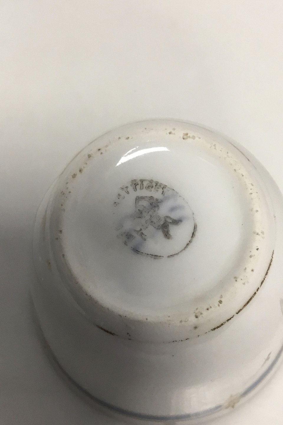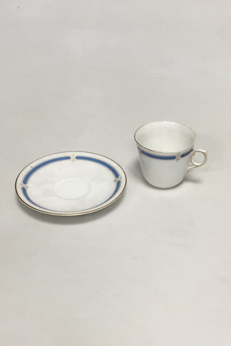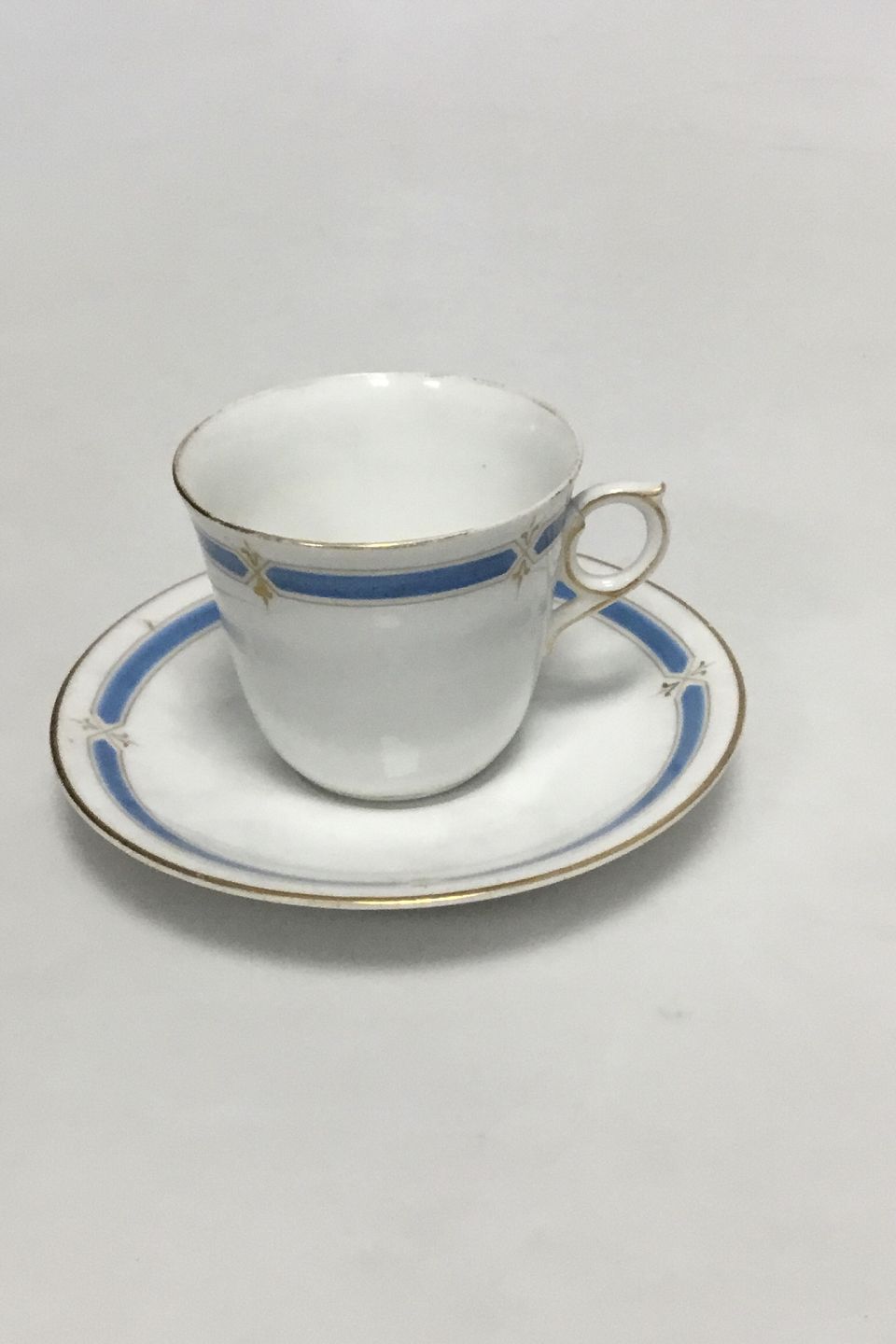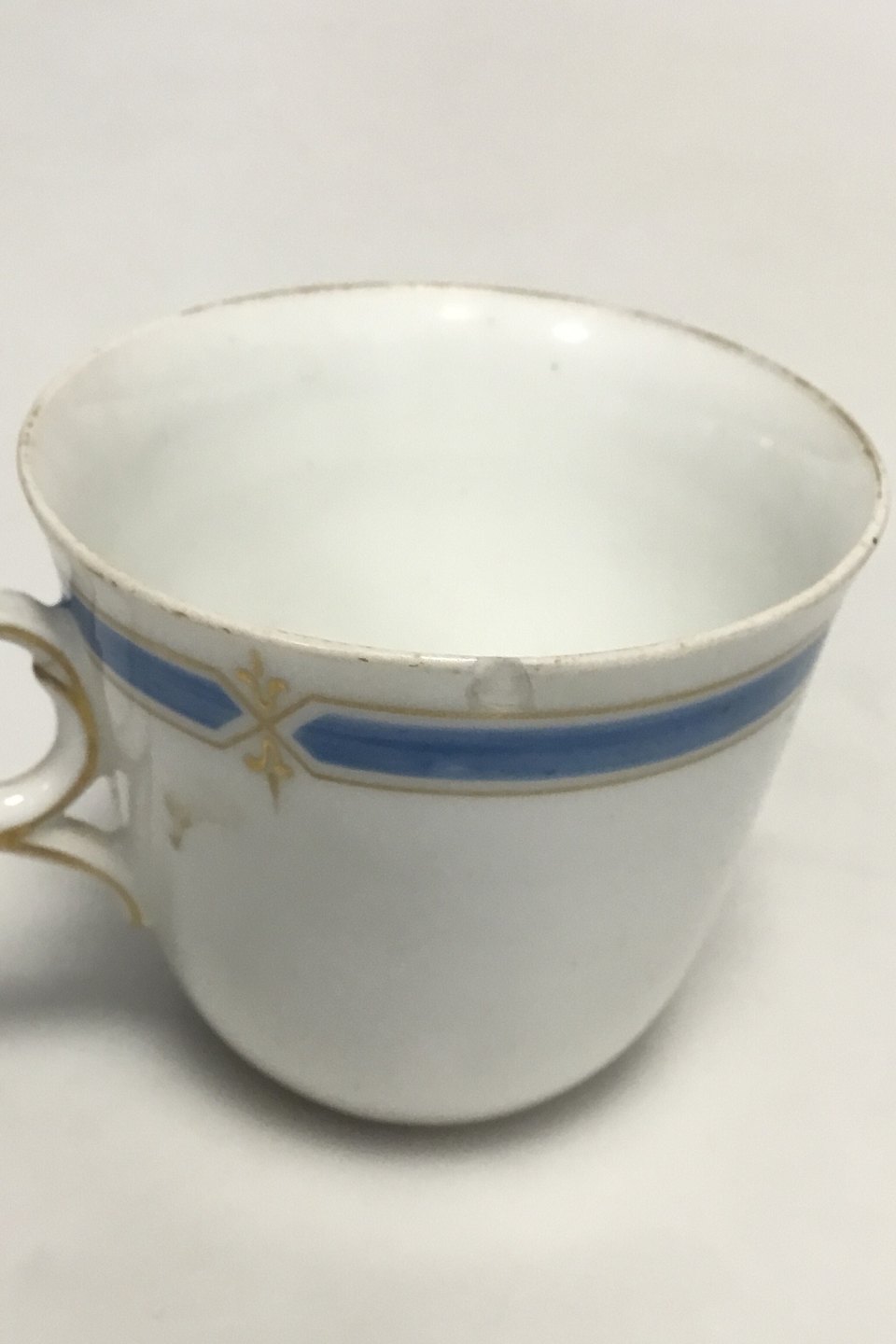 Frederiksborglottery Cup and Saucer with blue decor and gilt. Both parts stamped with angel, the saucer has the Royal Copenhagen 3 waves mark. Some damages and the handle repaired. See pictures. H: 6 cm (2 23/64")