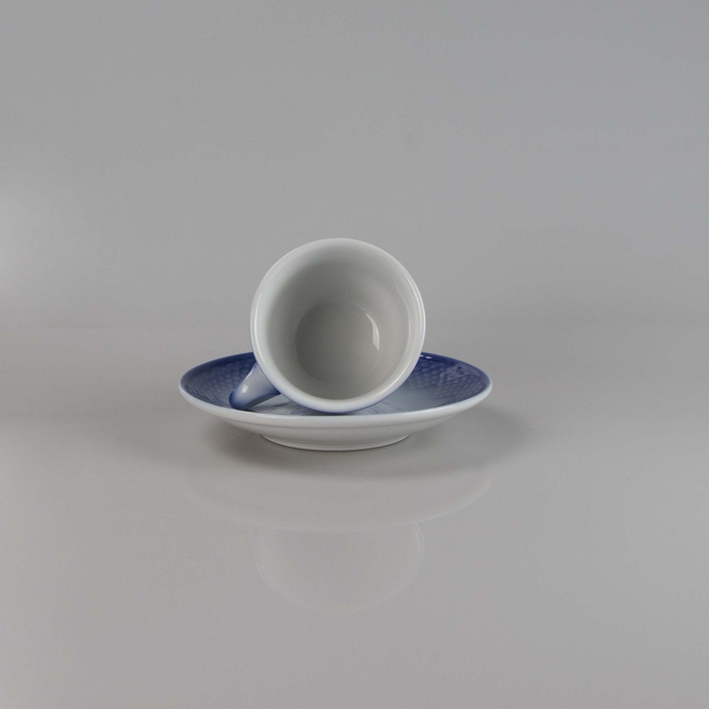 Kop fremstillet i hotelporcelæn med skelform i gradueret blå nuancer.