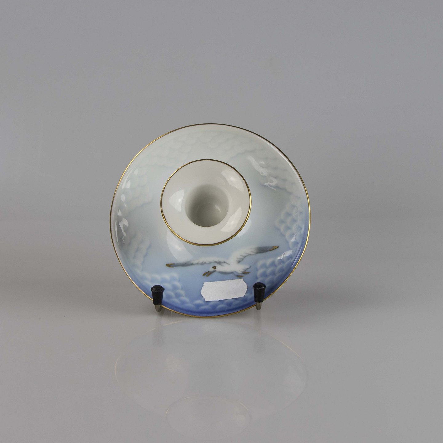 Lysestage fremstillet i porcelæn med skelform i gradueret blå nuancer med guldkant samt motiv af måge.