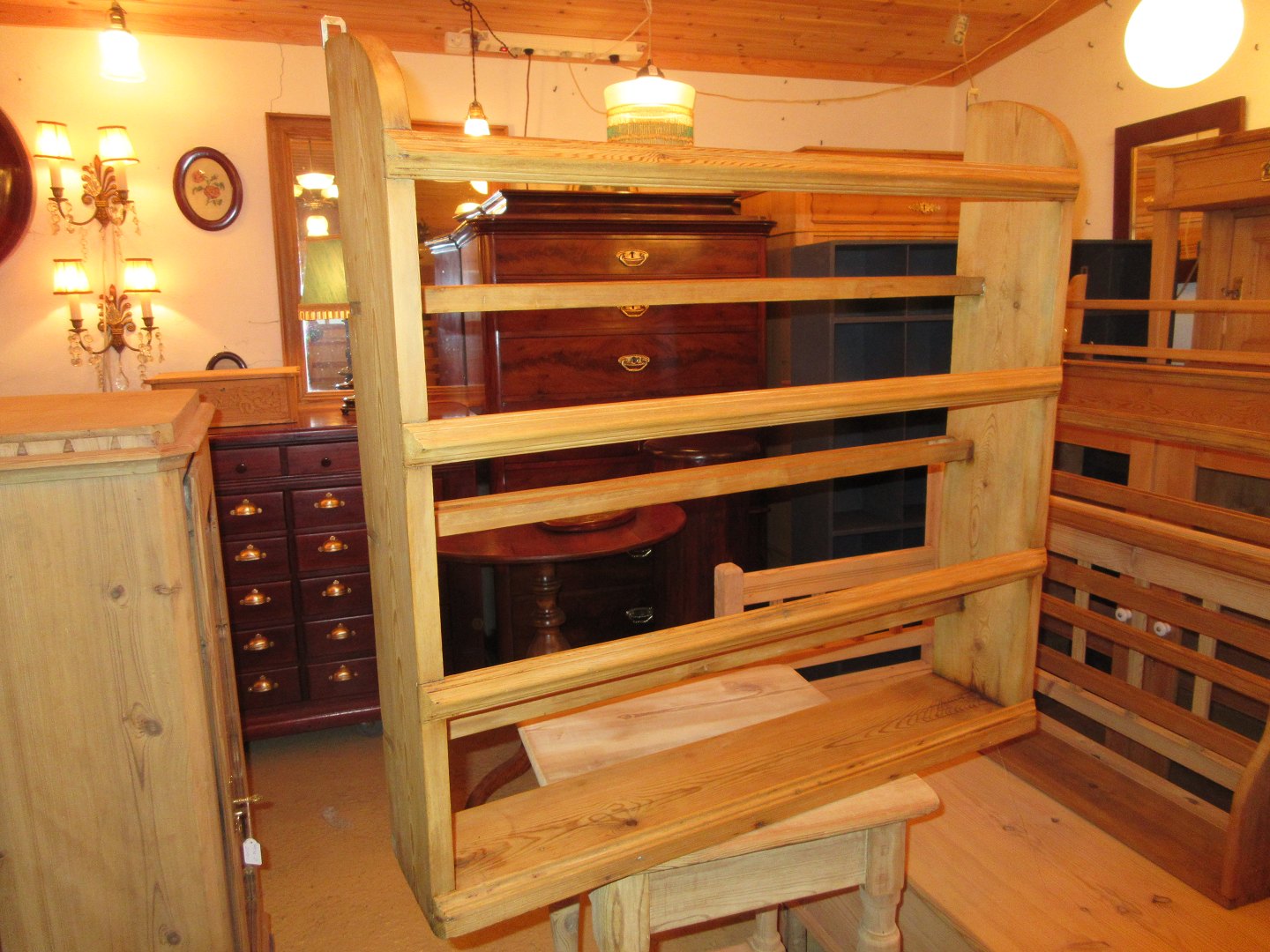 Tallerkenrække 3 rækker og 1 hylde afsyret fyrretræ restaureret og i fin stand mål, H 77, D 16, B 78,cm 365/66-P