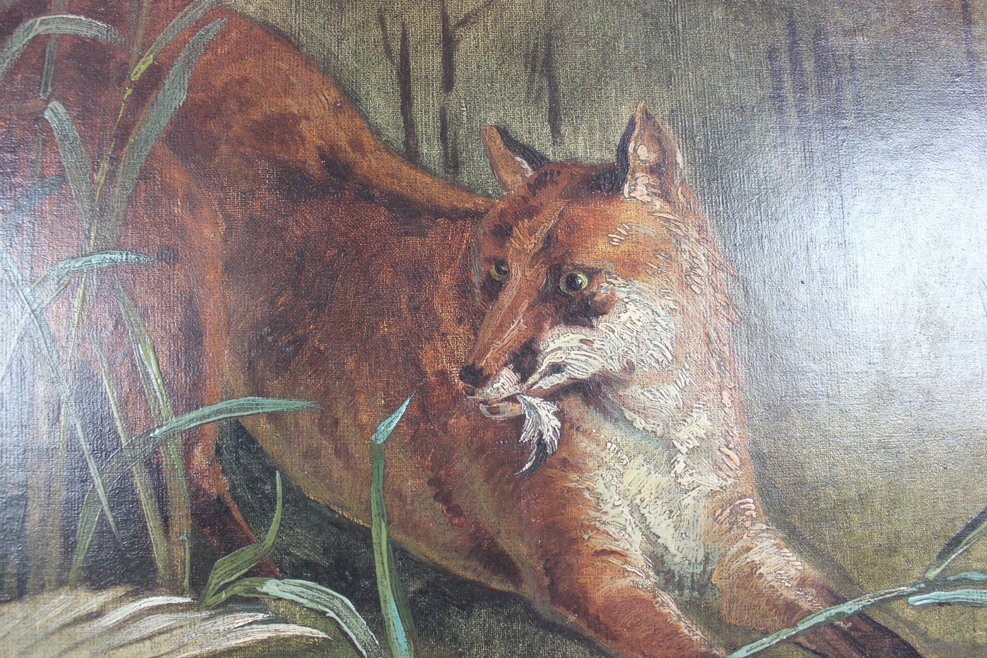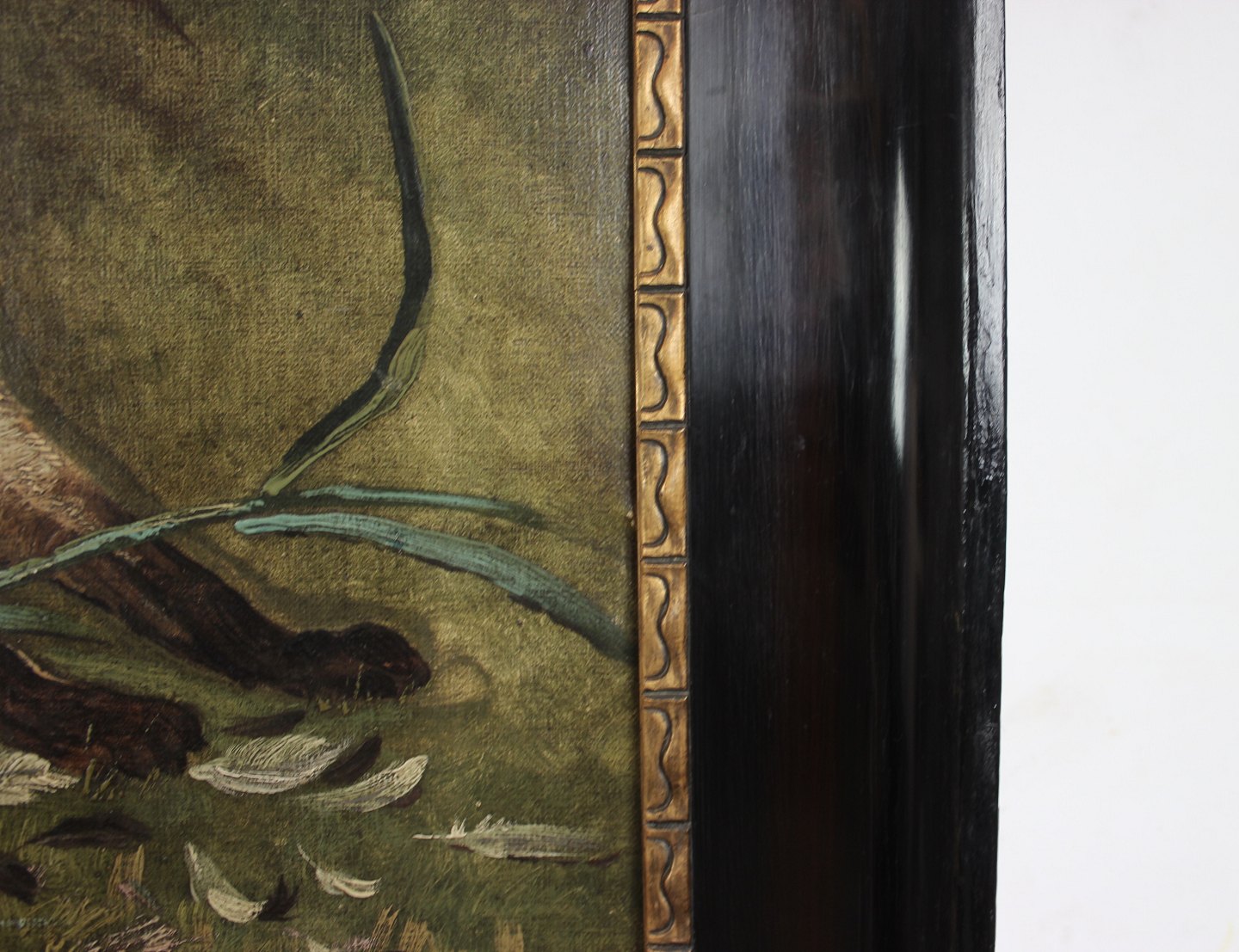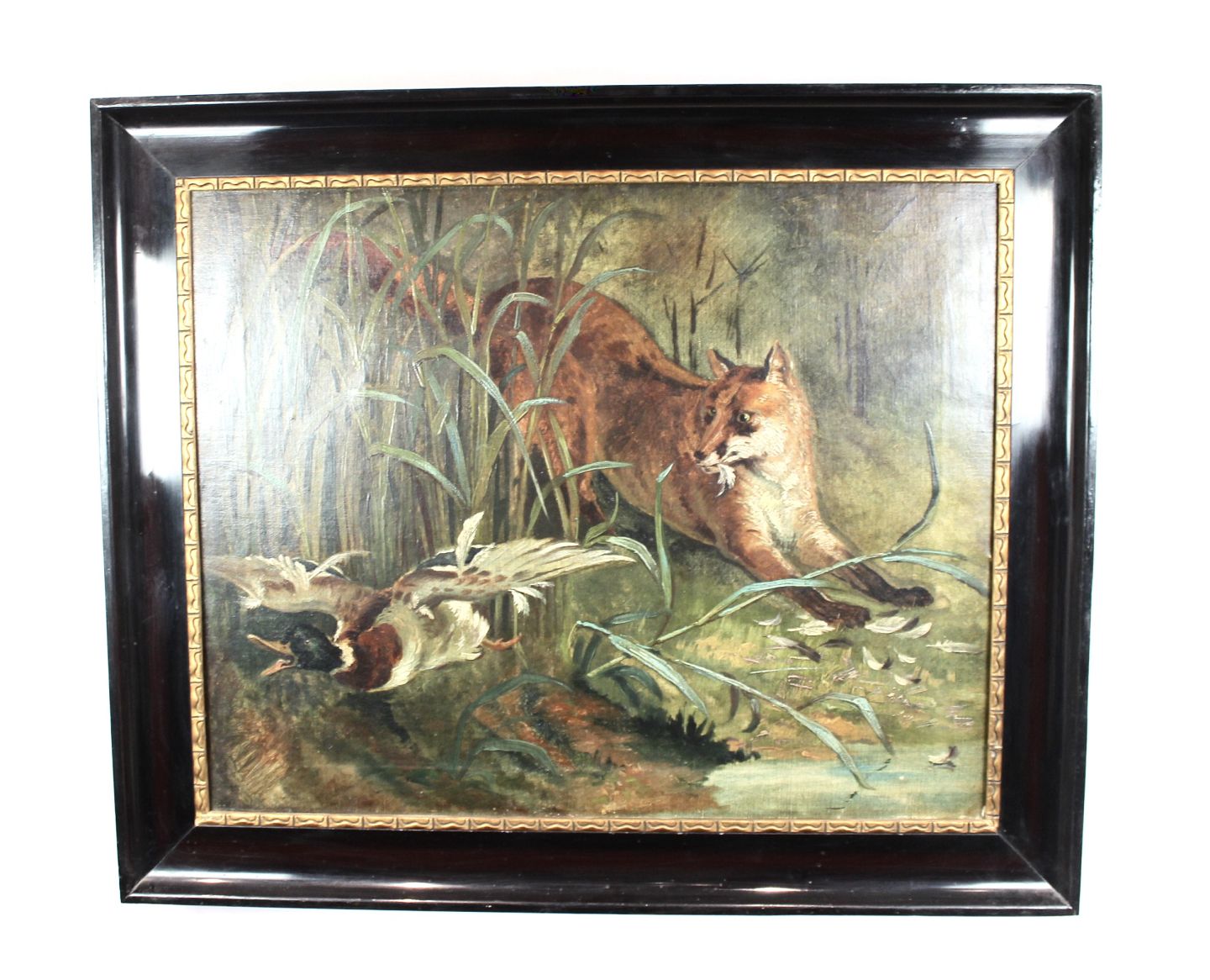 Oliemaleri med dyremotiv og med sort ramme uden signatur.