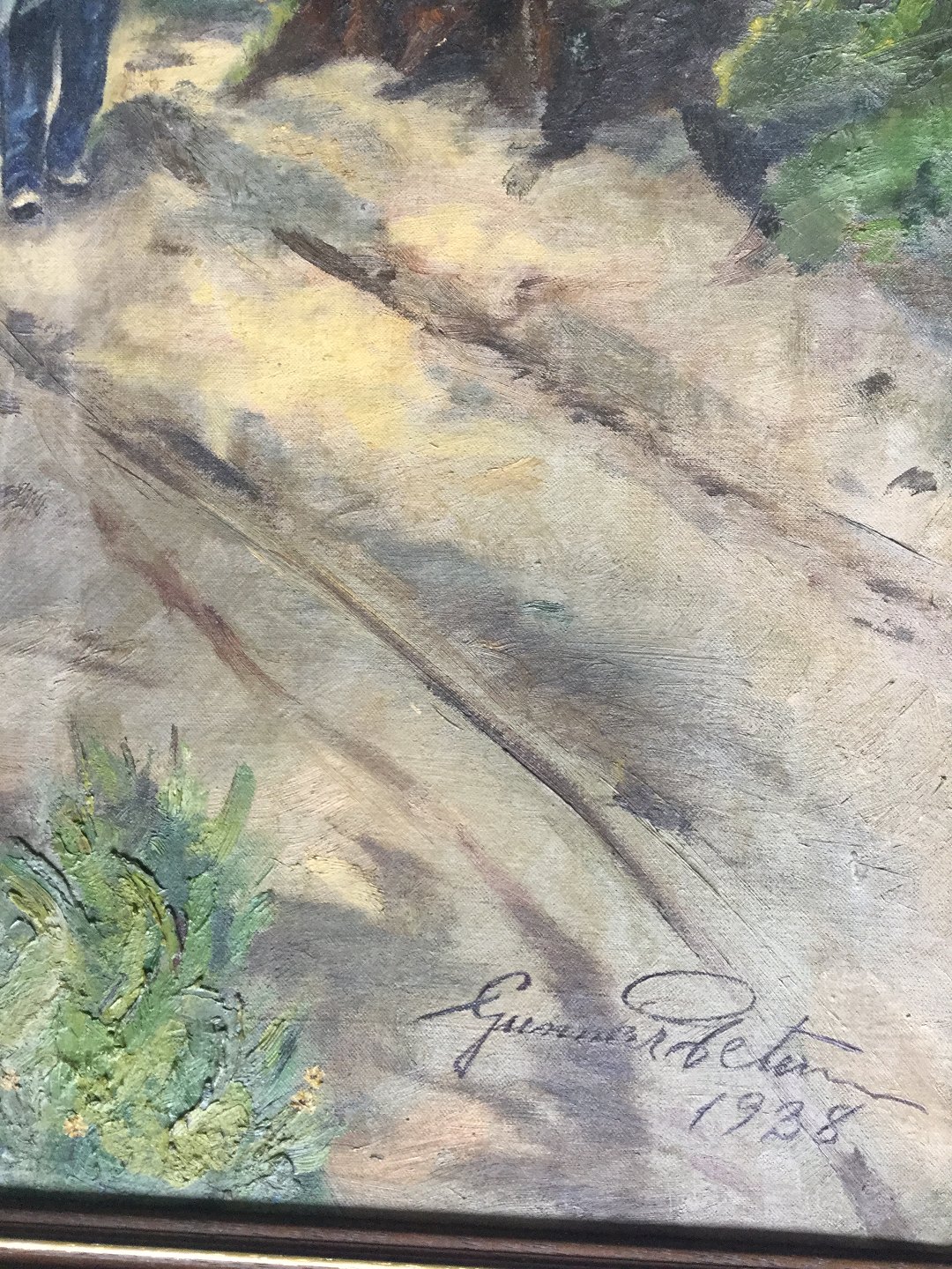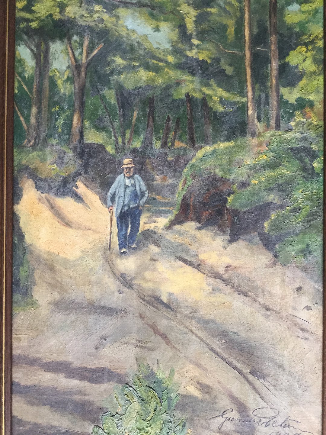 Maleri af Gunnar Petersen - Skovparti med gående mand 1938.