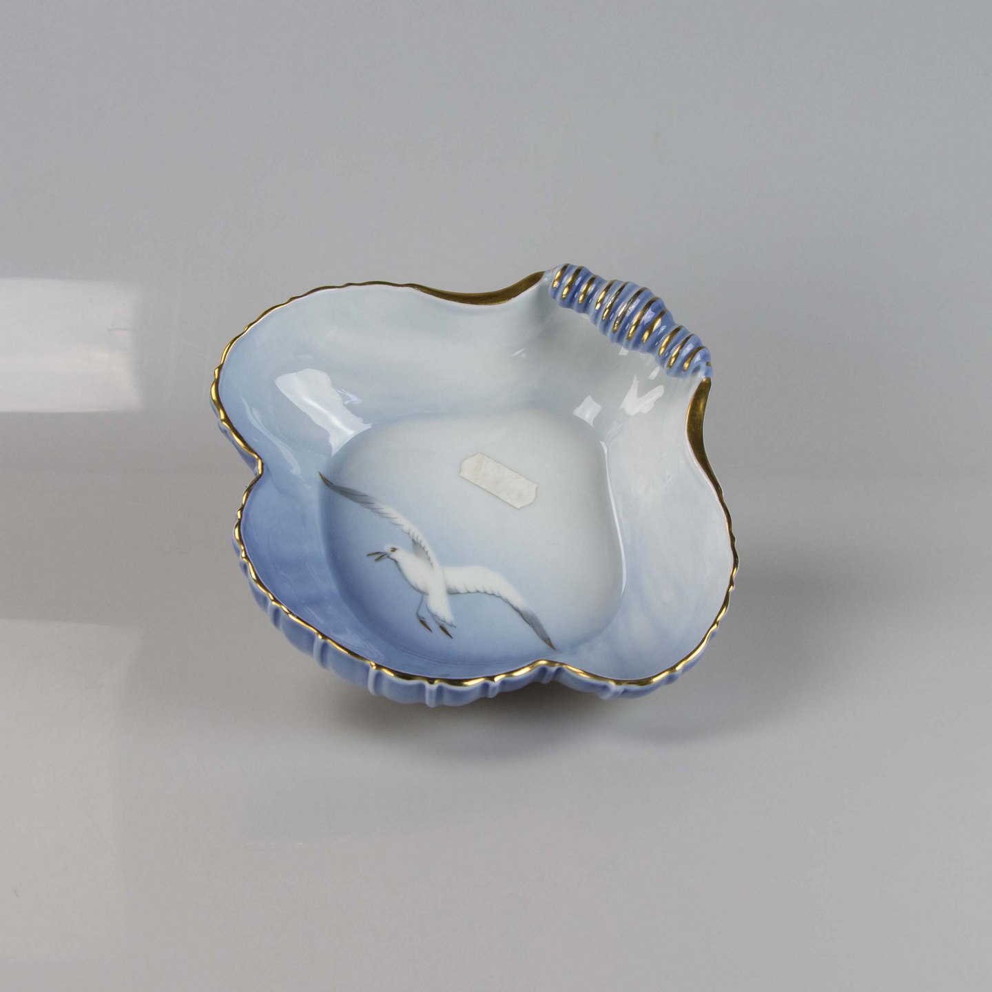 Skål fremstillet i porcelæn med skelform i gradueret blå nuancer med guldkant samt motiv af måge.