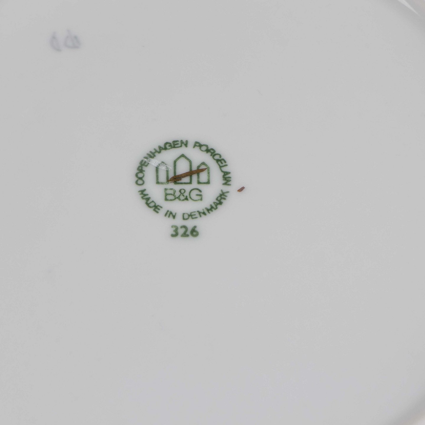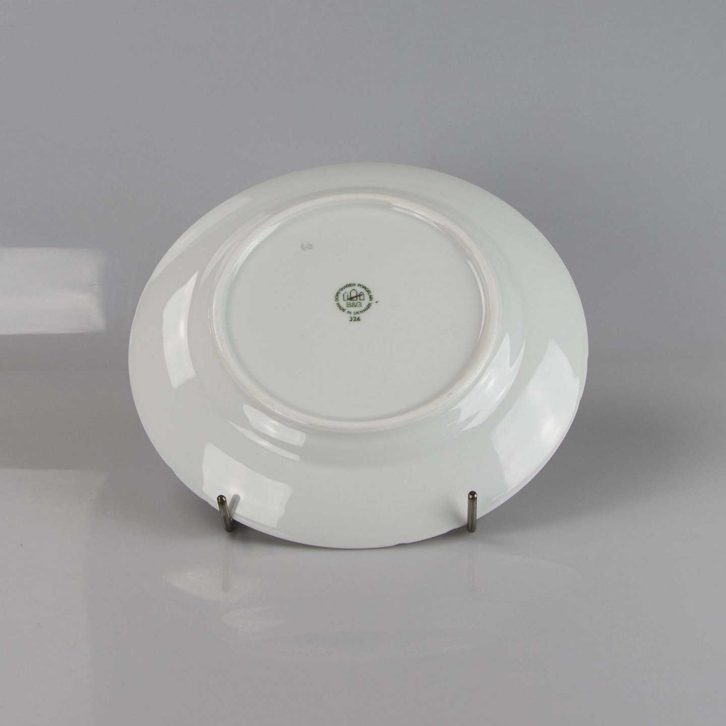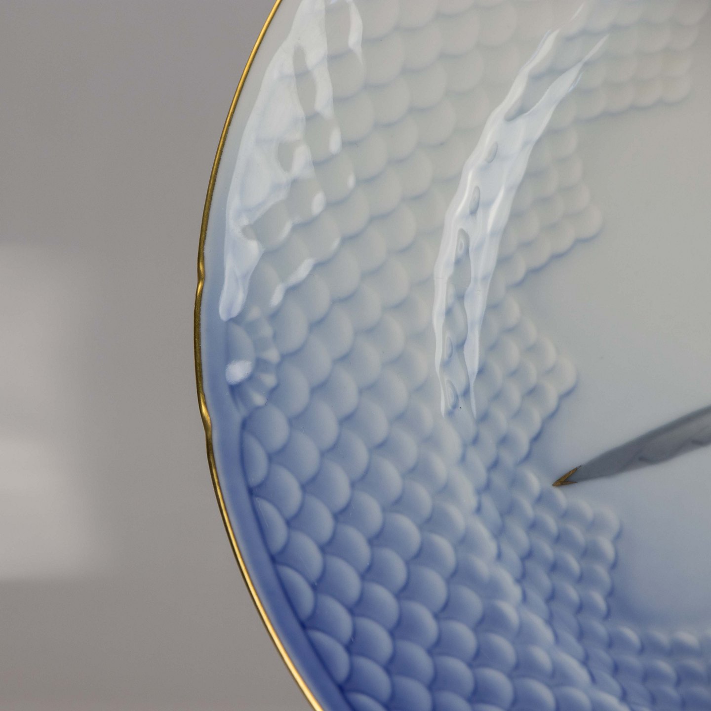 Tallerken fremstillet i porcelæn med skelform i gradueret blå nuancer med guldkant samt motiv af måge.