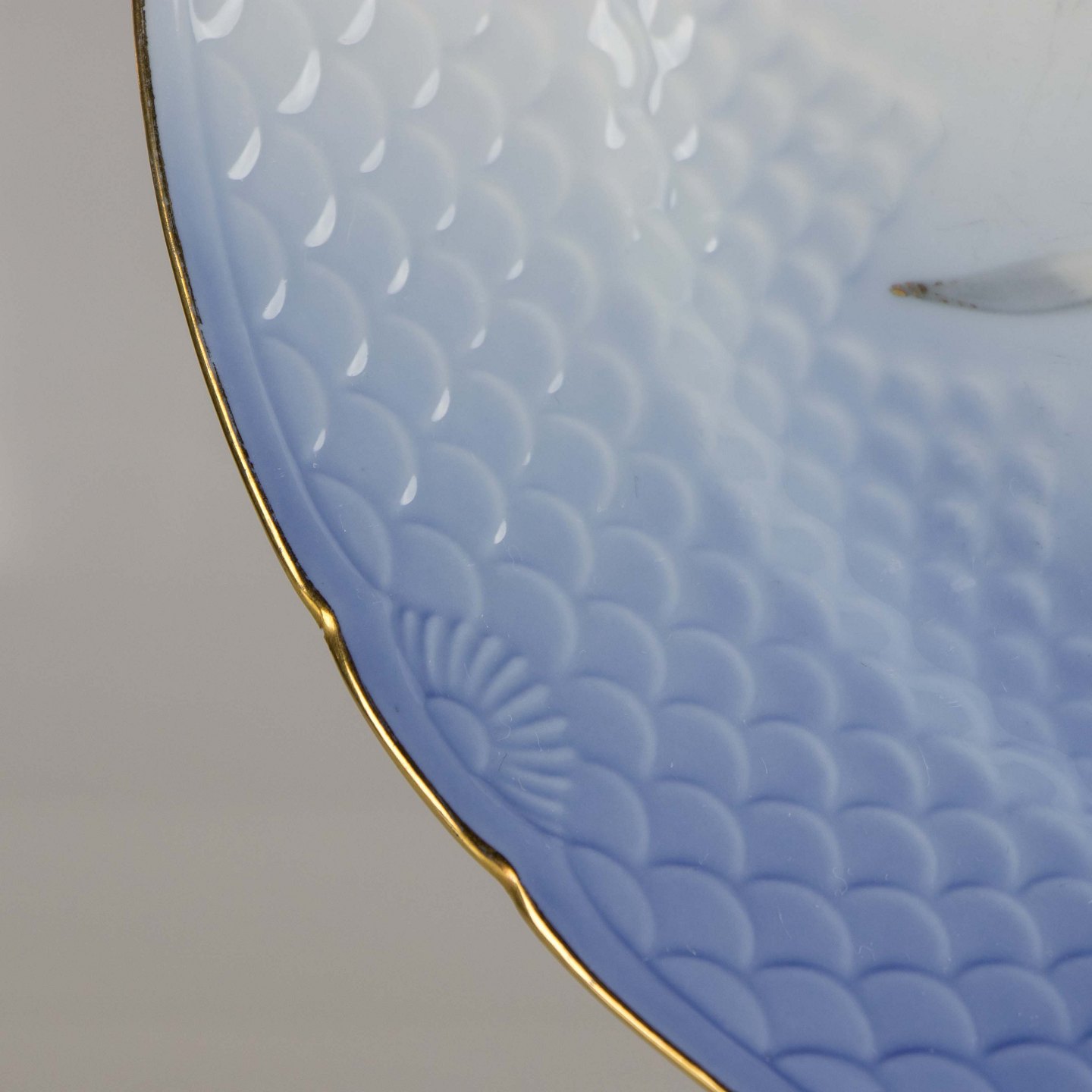 Tallerken fremstillet i porcelæn med skelform i gradueret blå nuancer med guldkant samt motiv af måge.
