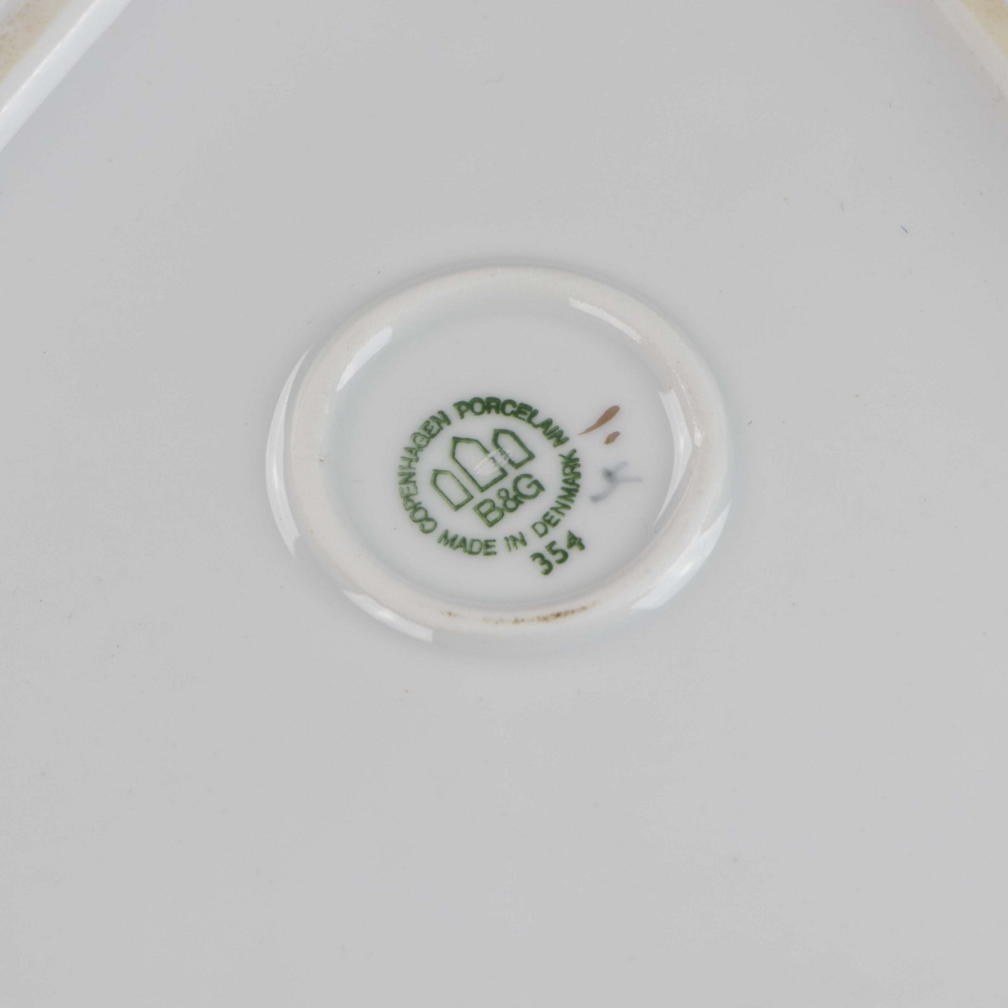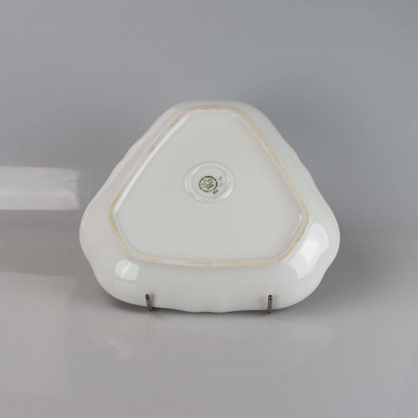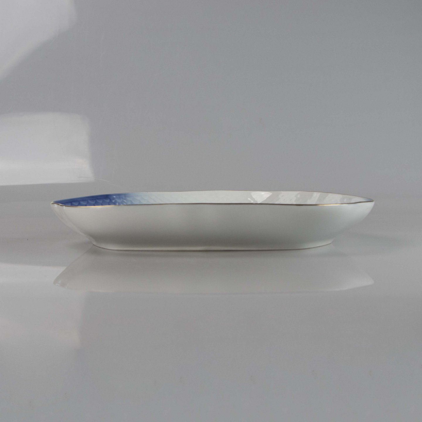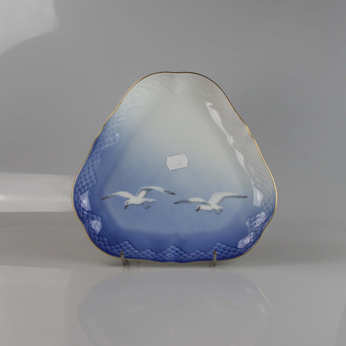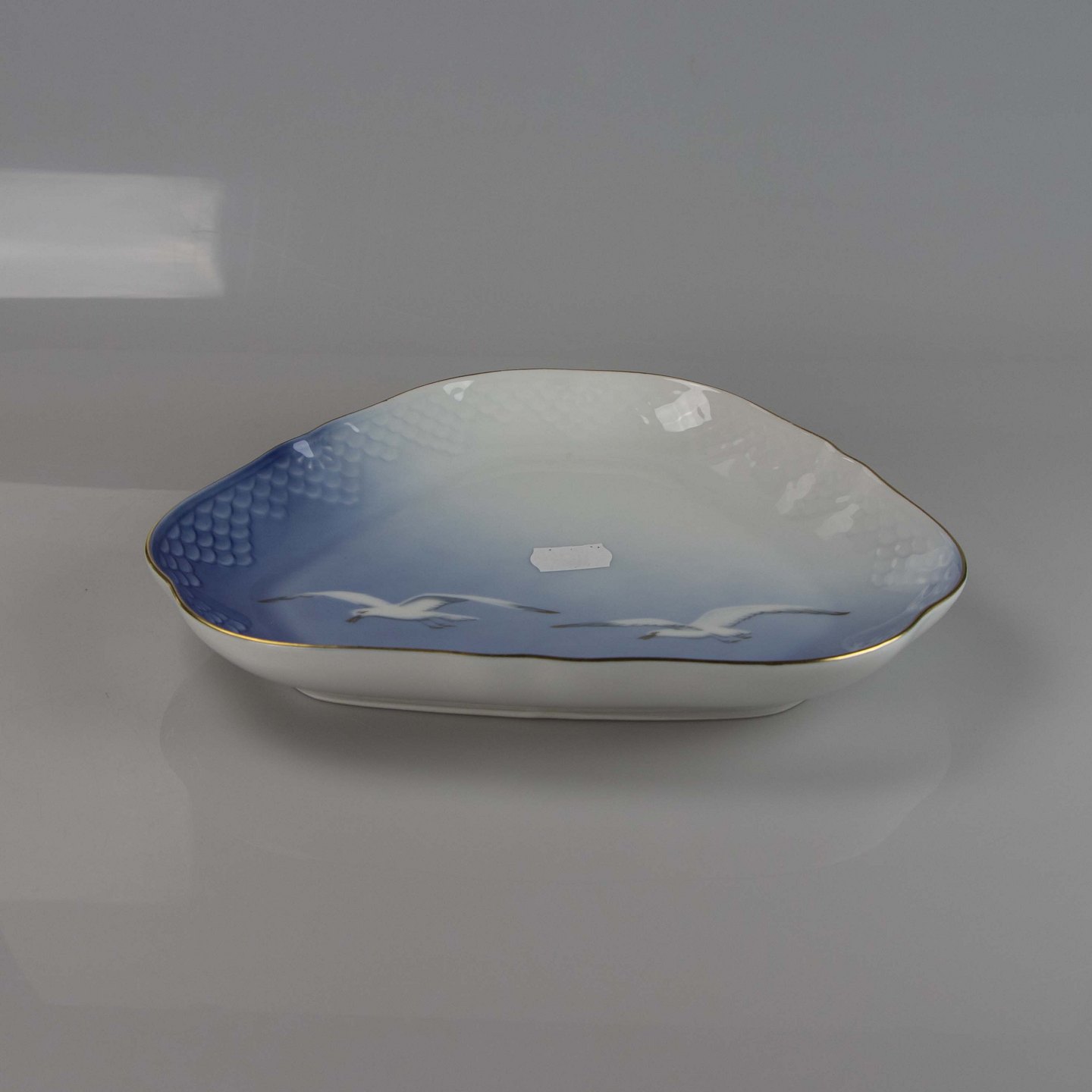 Fad fremstillet i porcelæn med skelform i gradueret blå nuancer med guldkant samt motiv af måge.
