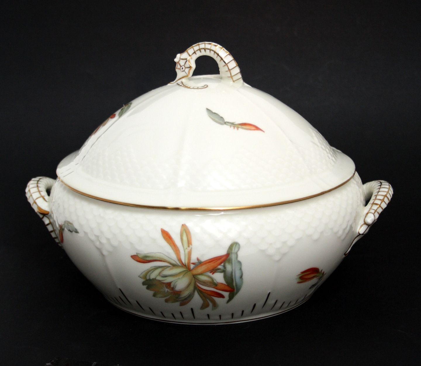 Bing & Grøndahl, Kaktusblomst, cremefarvet stel med guldkant og motiv med kaktusblomst. Terrin med låg. Formnr. 5. Højde 17,5 cm. Diameter fra hank til hank 25,5 cm. God stand. Pris: 475 kr. stk. Lager: 1