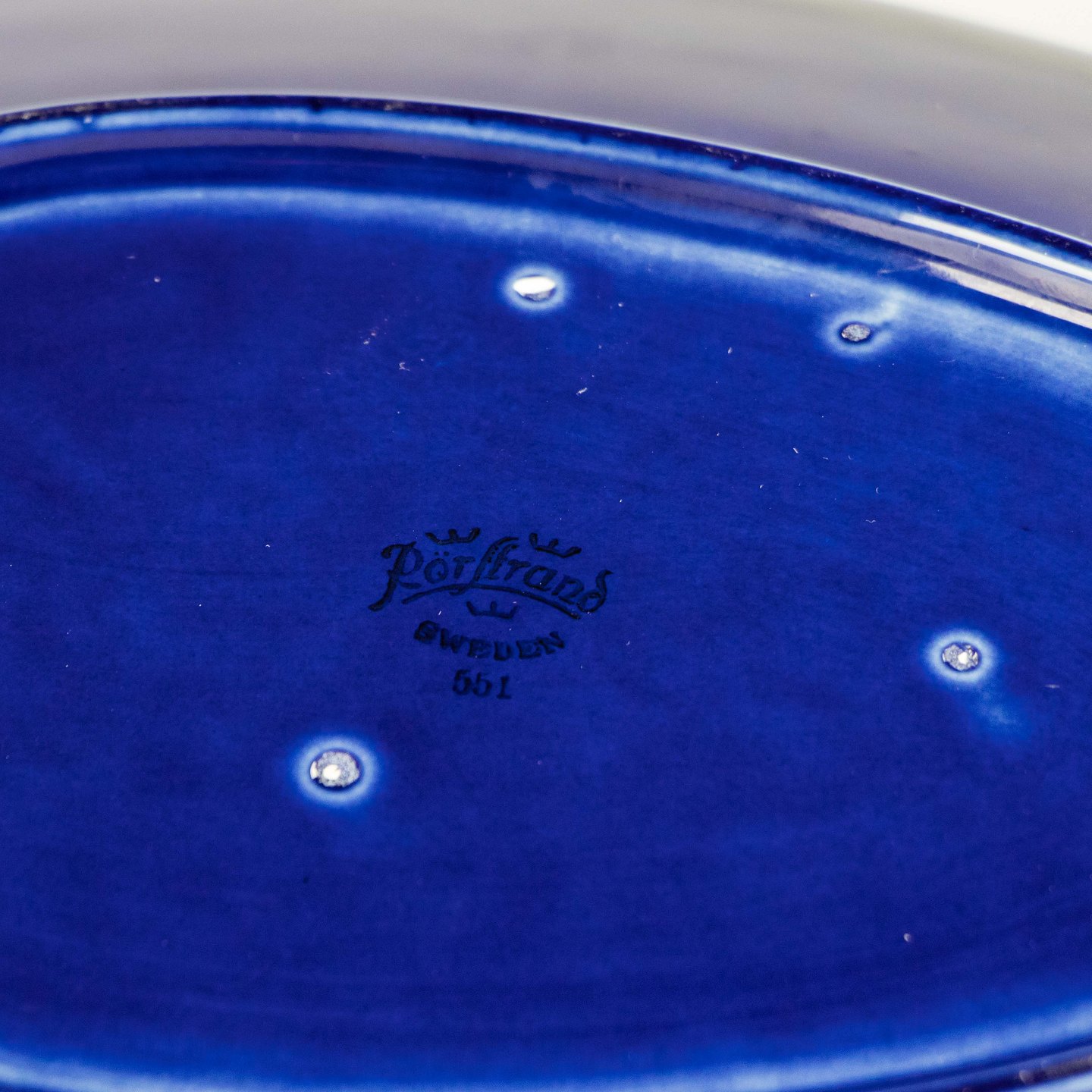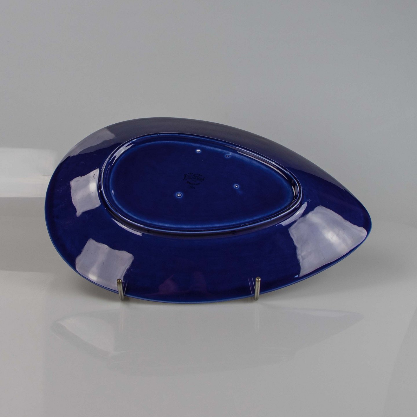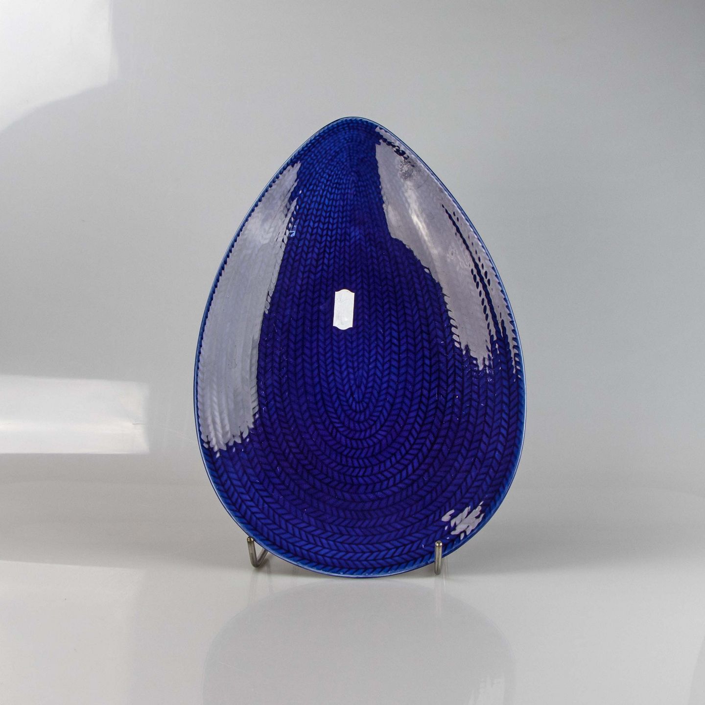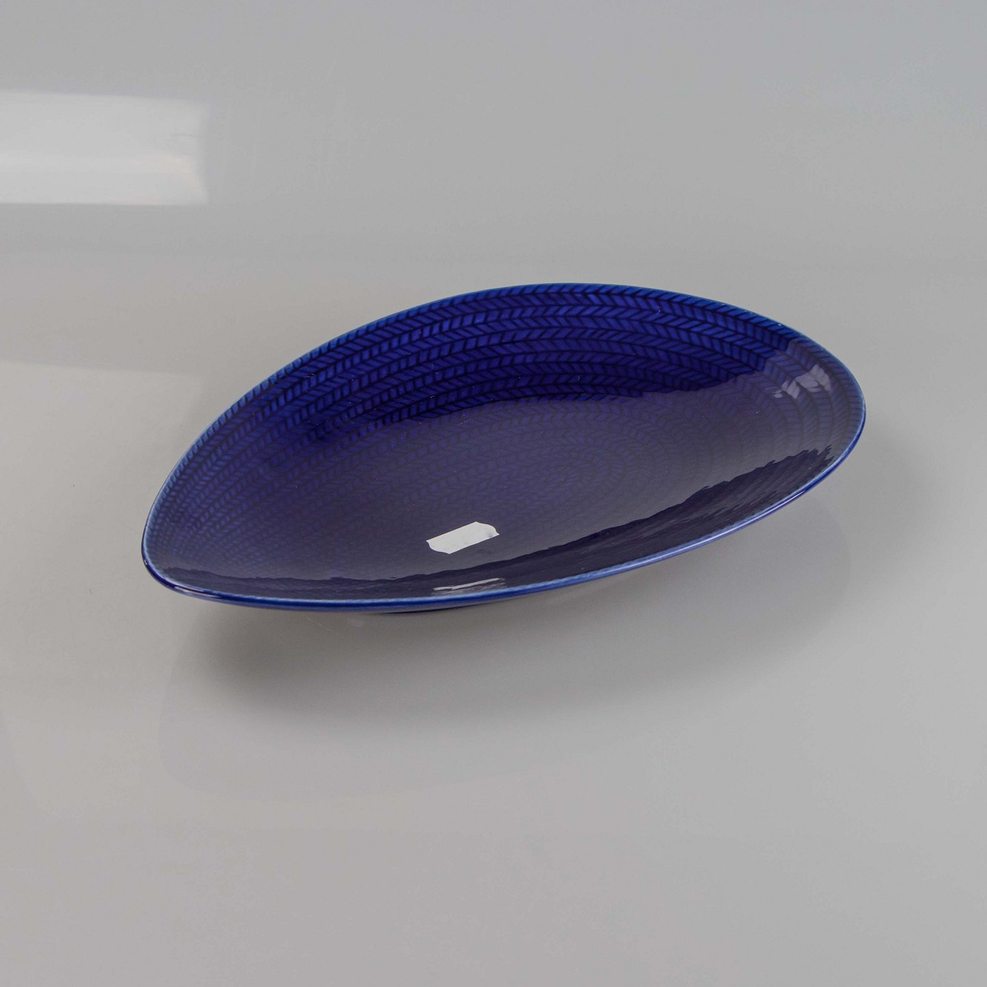 Fad fremstillet i blå fajance med indstøbt sildebensmønster.