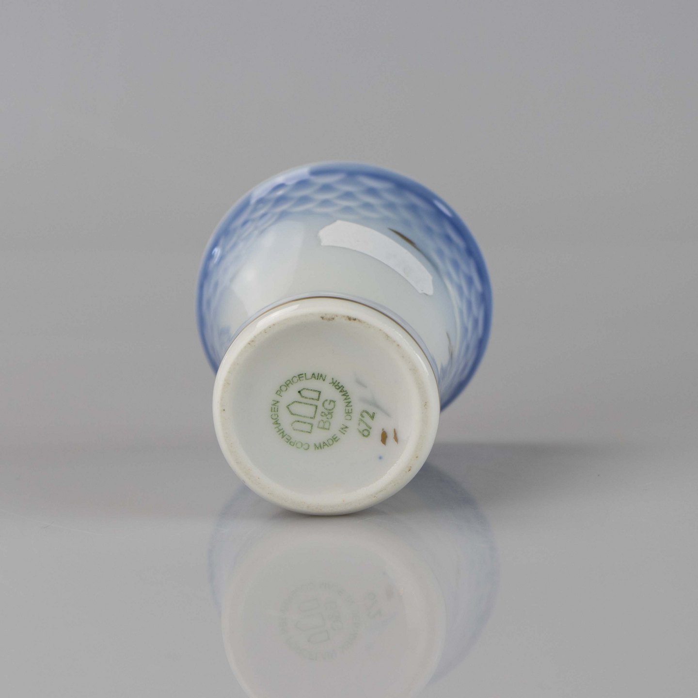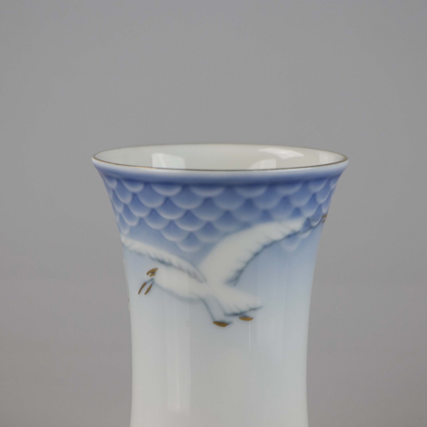 Vase fremstillet i porcelæn med skelform i gradueret blå nuancer med guldkant samt motiv af måge.