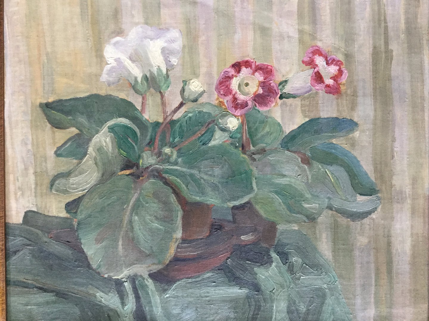 Blomster i lerpotter på bord.