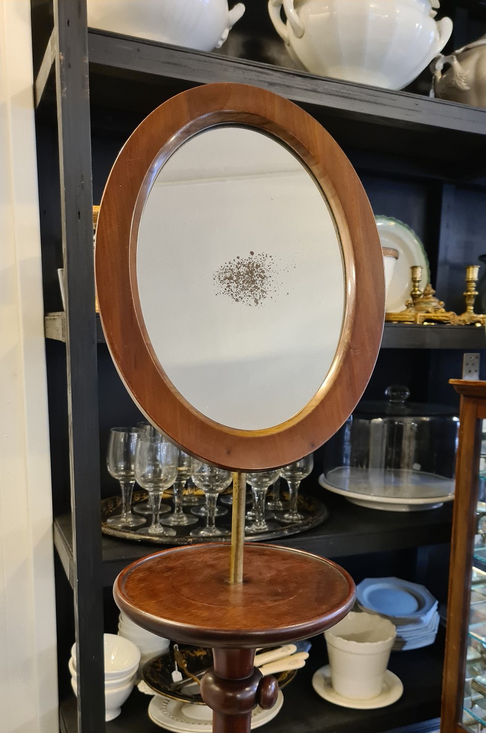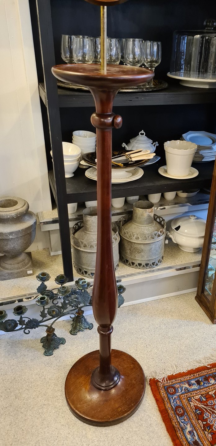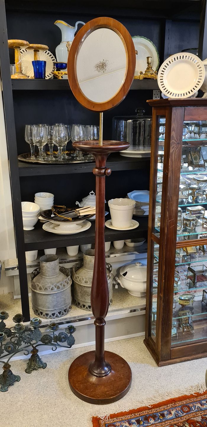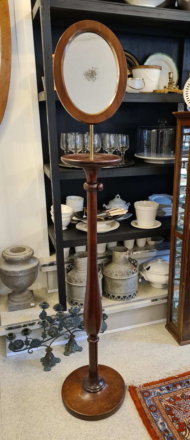 Piedestal i mahogni med justerbart spejl. Spejlet er skråt, så man kan se hvordan slips, butterfly og hat sidder.