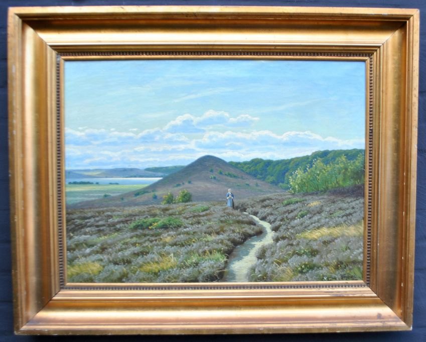 Thoring, H (Pseudonym for Kai Drews) (1884 - 1964) Danmark: En gående kvinde i lyngbakker. Olie på lærred. Signeret. 50 x 68 cm.