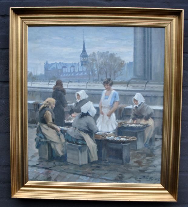 Bjulf, Søren Christian (1890 - 1958) Danmark: Fiske konerne på Gammel Strand, København. Olie på lærred. Signeret. 62 x 54 cm.