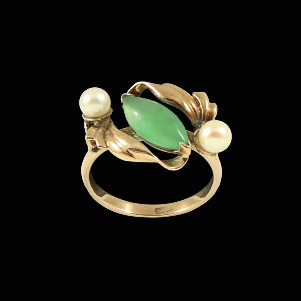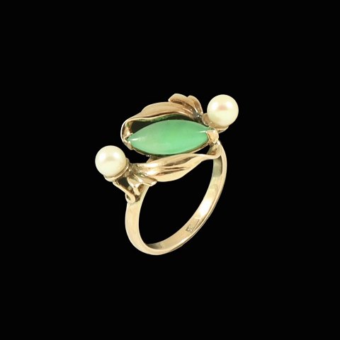 Ring i 14k guld med jade og perler.