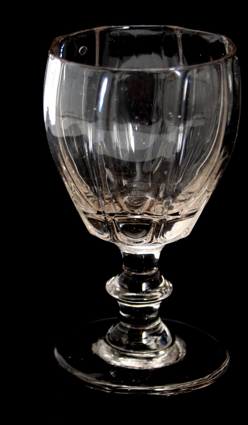 Tøndeglas med udvendig snerle, antagelig svenske, knækket i bund ca. 1840. Med luftbobler.