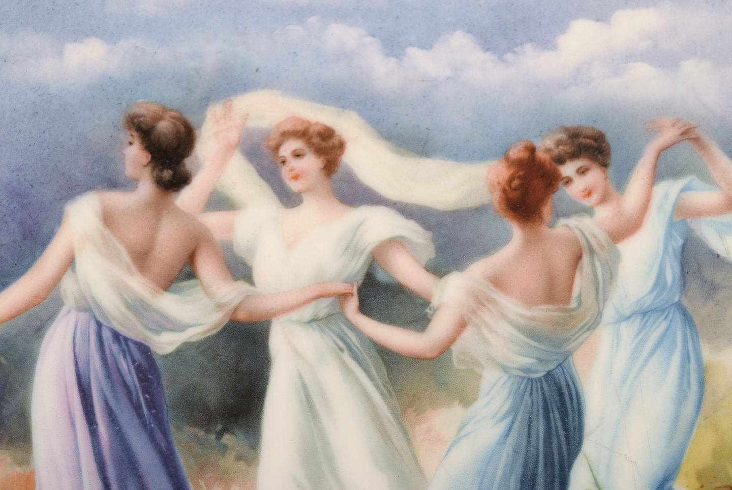 Limoges, Frankrig. Stort antikt fad i håndmalet porcelæn dekoreret med dansende kvinder og guldkant. Tidligt 1900-tallet.