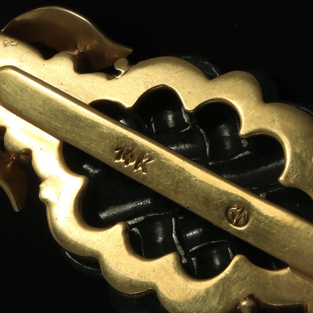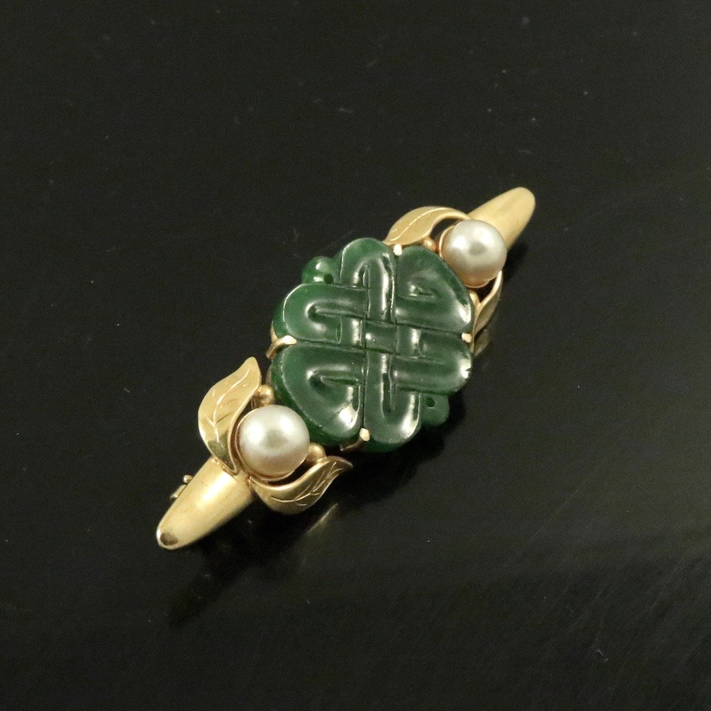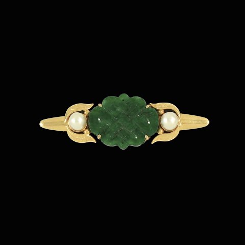 Gerson Davidsen. Broche i 14k guld med jade og perle.