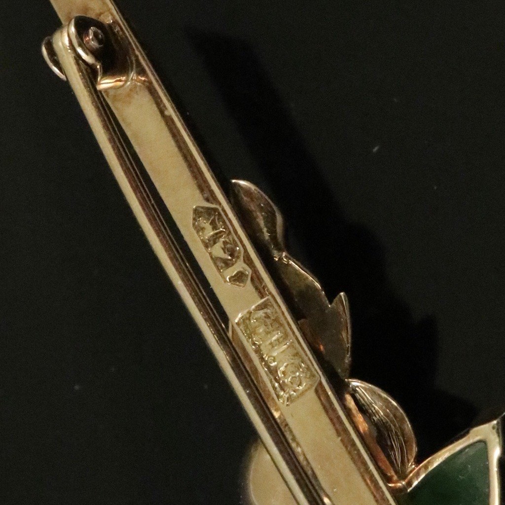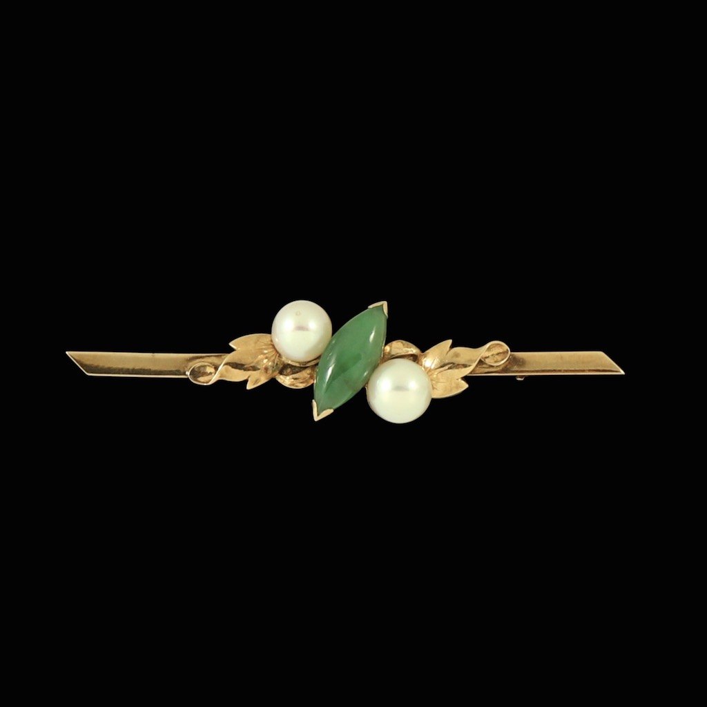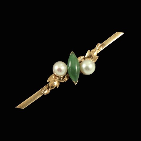 Broche i 14k guld med jade og perler.