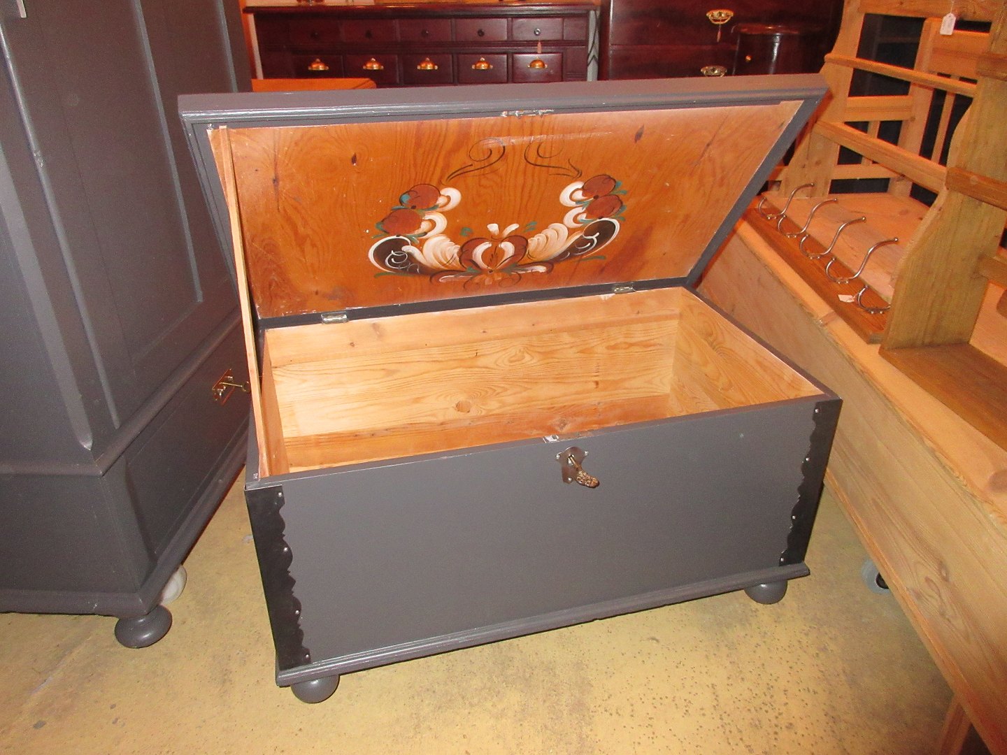 Kiste restaureret og malet grå, i fin stand Mål H 46, B 90, D 55,cm 524/28-P