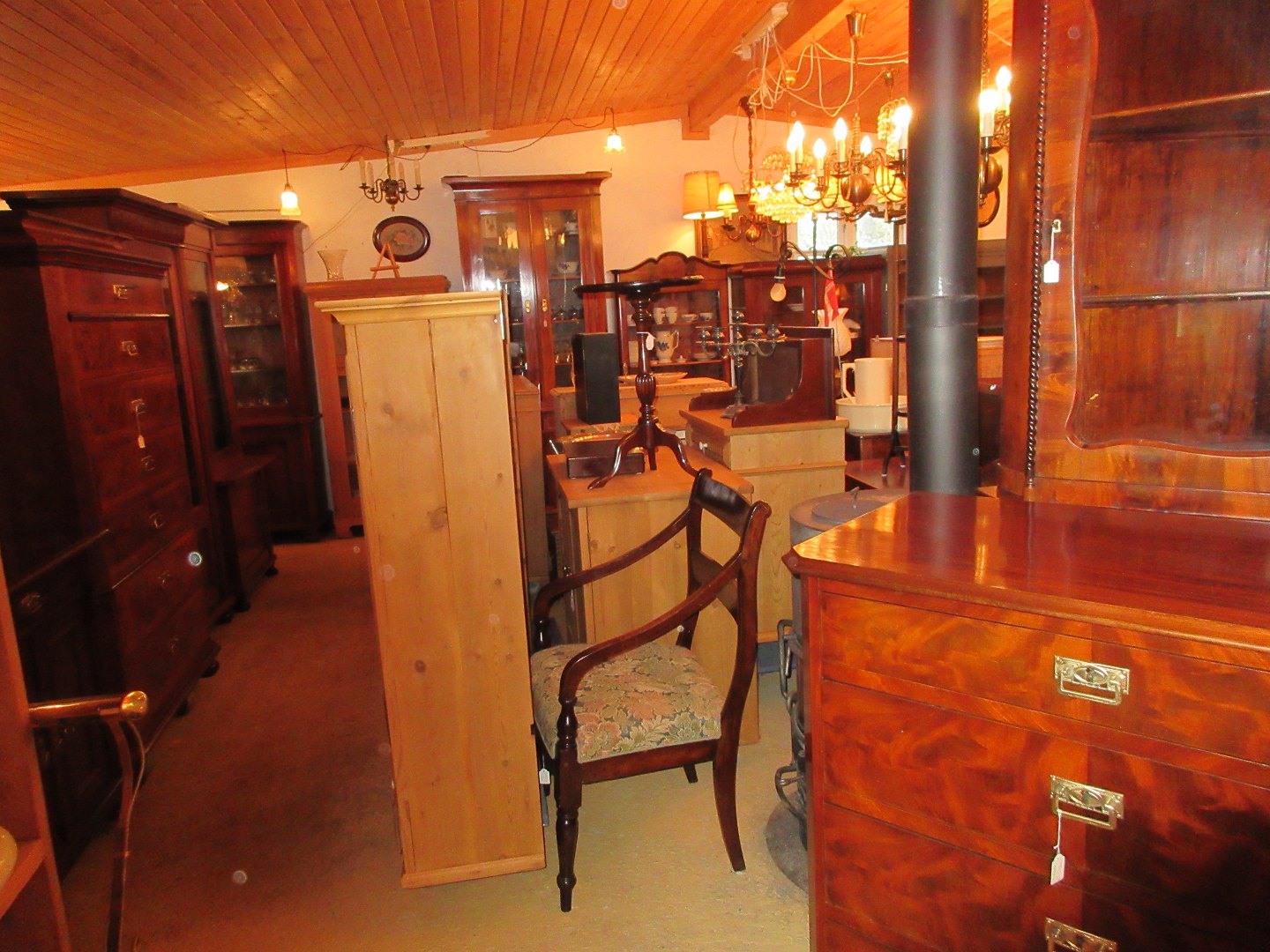 Stor salgsudstilling med restaurerede møbler håndpolerede mahognimøbler, afsyrede fyrretræsmøbler, malede træmøbler, kun originale gamle og antikke møbler.