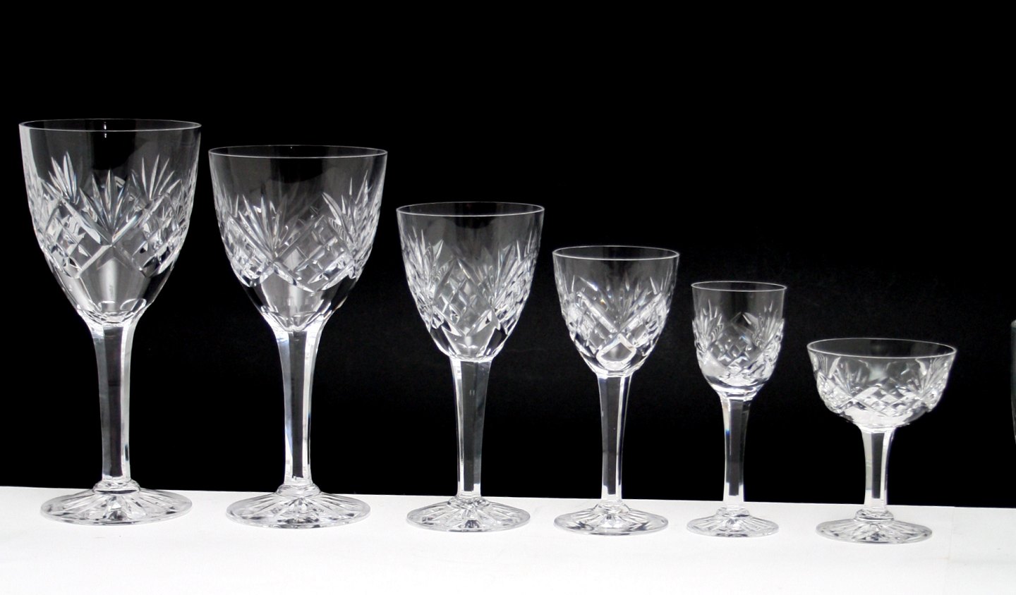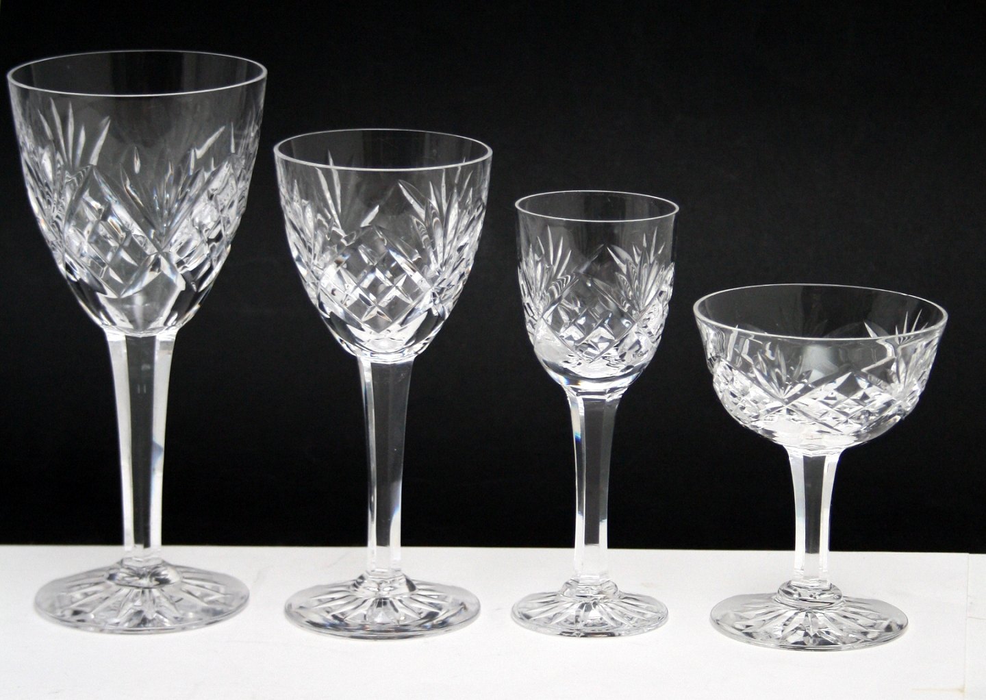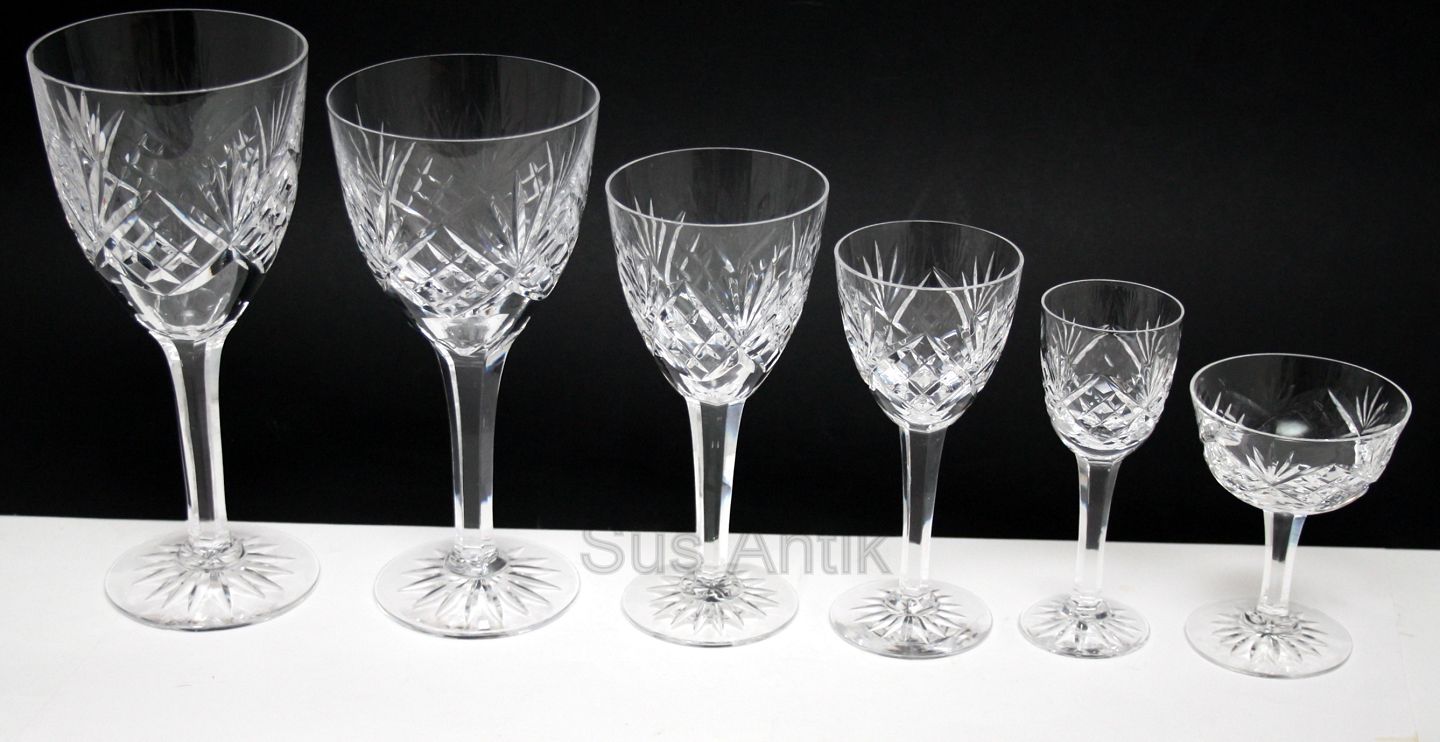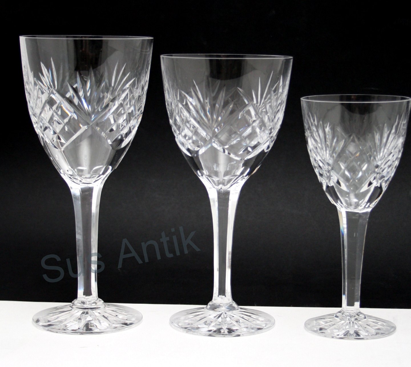 Text available in Danish: Krystalglas med Helga slibning og krydsslibning på fod, lavet af flere svenske glasværker. Helkrystal med krydsslibninger på kummen og slebet stilk og fod. Alm. brugsslid