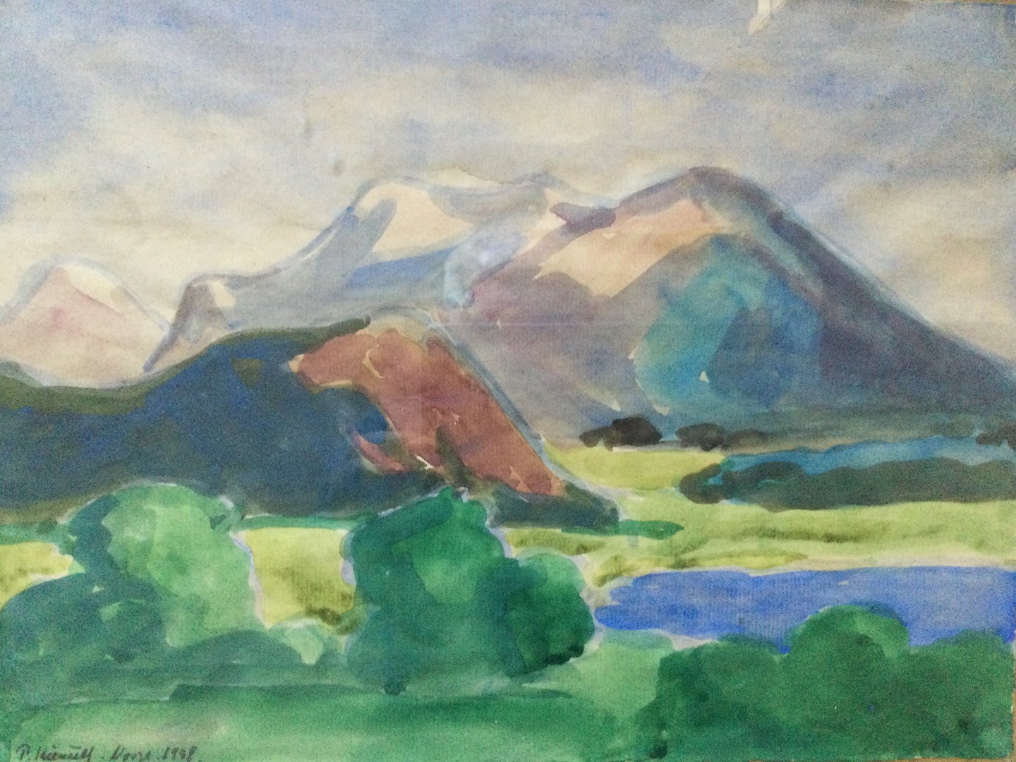 Text available in Danish: Akvarel af Palle Kierulf - Norsk fjeldlandskab - indrammet i antik sølvramme.